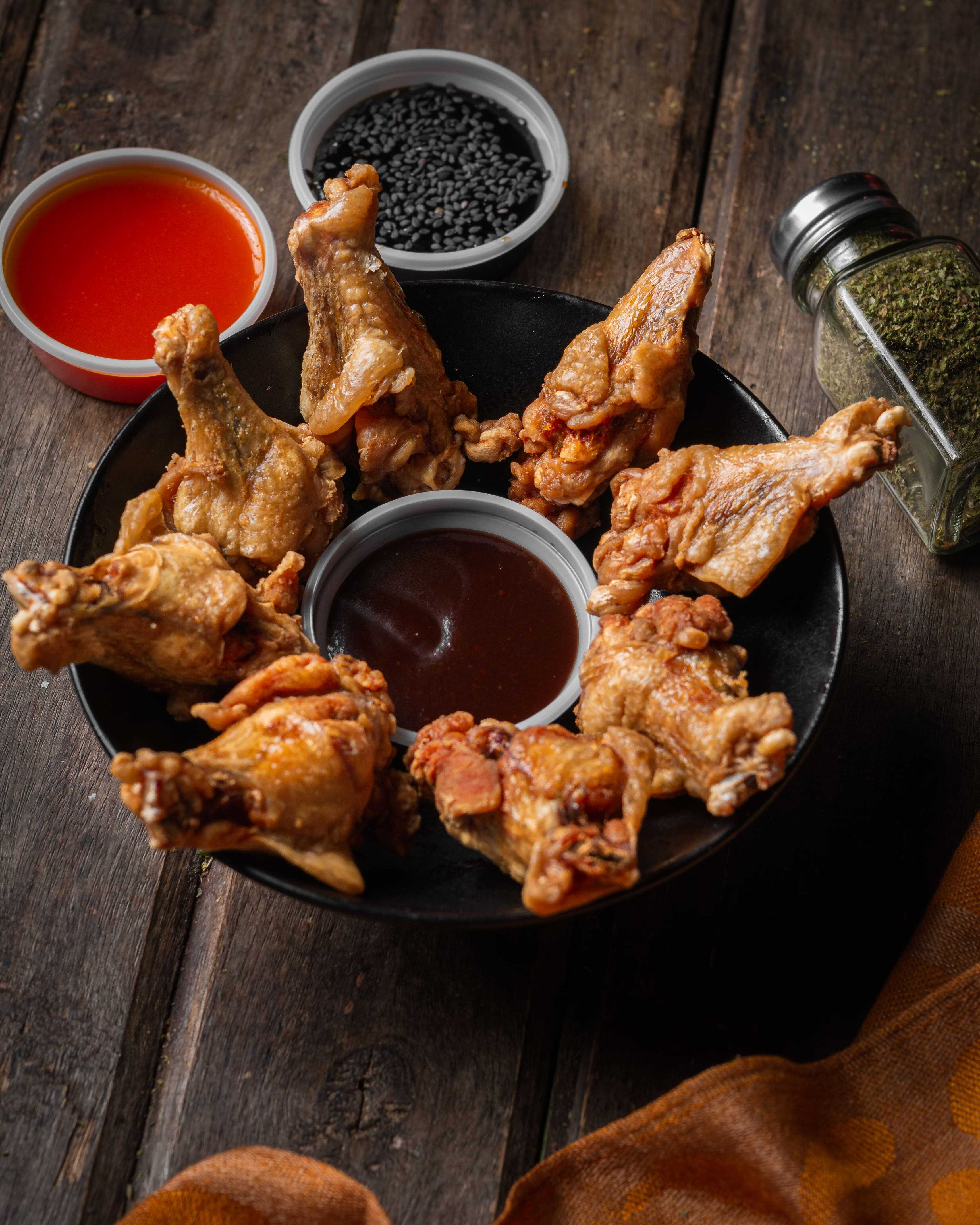 24 Alitas de pollo bañada en salsa y aderezo a elegir.