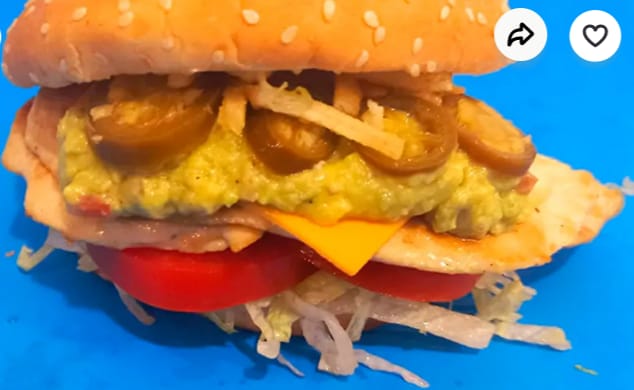 Pan, filete de pechuga, tomate, lechuga, queso edam, jalapeño, guacamole, papas al hilo y cremas a elegir.