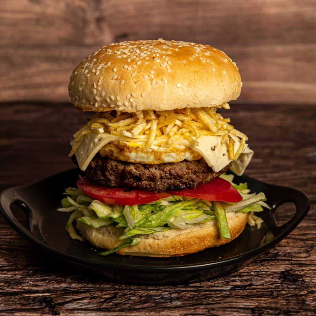Pan, carne 200 g, tomate, lechuga, huevo, queso edam, papas al hilo y cremas a elegir.