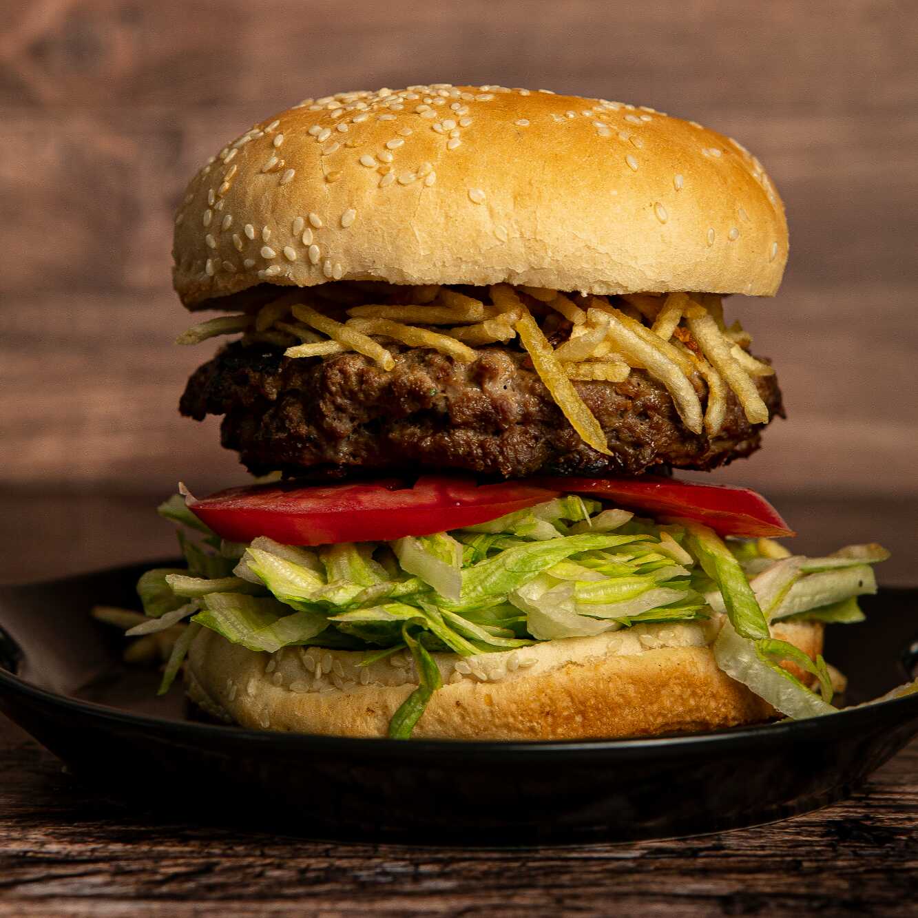 Pan, carne 200 g, tomate, lechuga, papas al hilo y cremas a elegir.