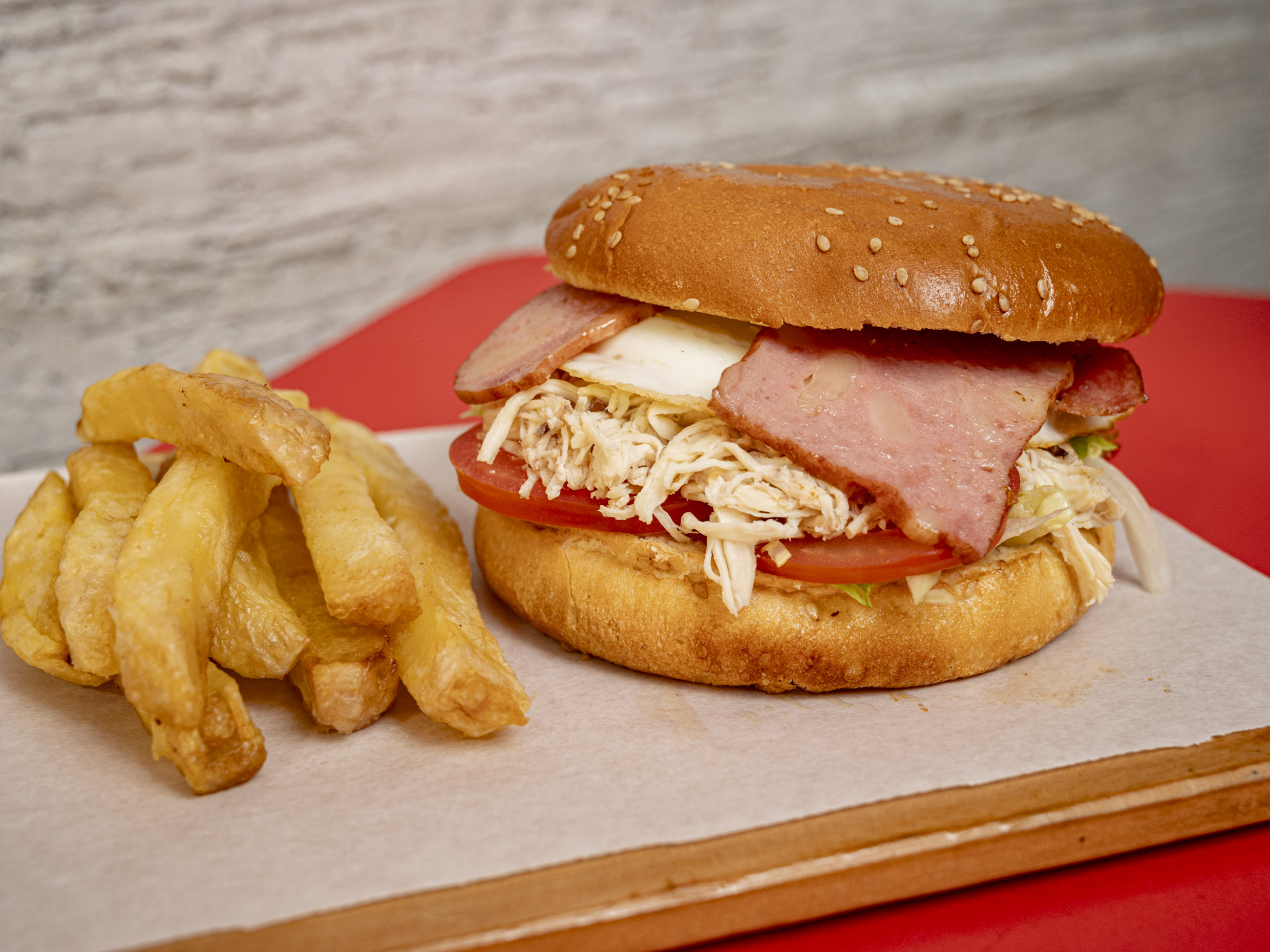clasico de clasico acompañado de papas fritas y arroz