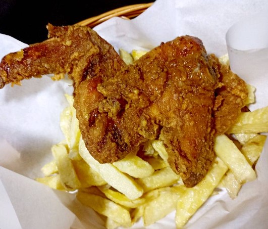 Alita broaster, acompañado de papas fritas, ensalada y sus cremas.