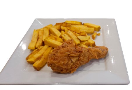 Pierna broaster, acompañado de papas fritas, ensalada y sus cremas.