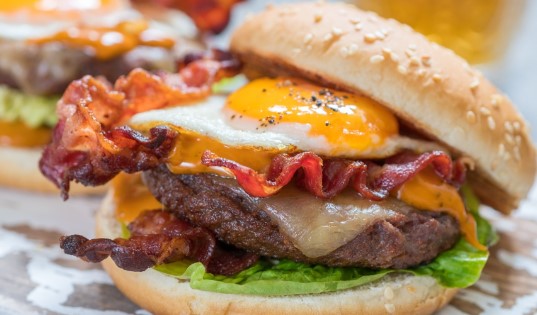 Crocantes papas fritas, hot dog, jugosas hamburguesas cacera, tocino y huevo de doble yema.