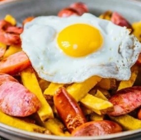 Crocantes papas fritas chorizo y huevo.