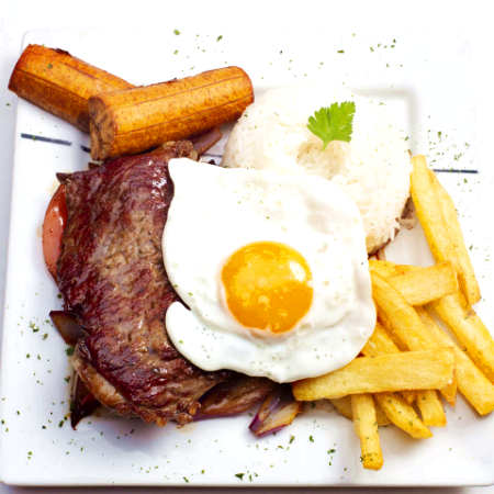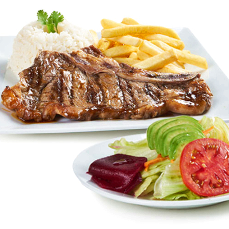 churrasco de 150 gr acompañado de papas frita arroz y ensalada