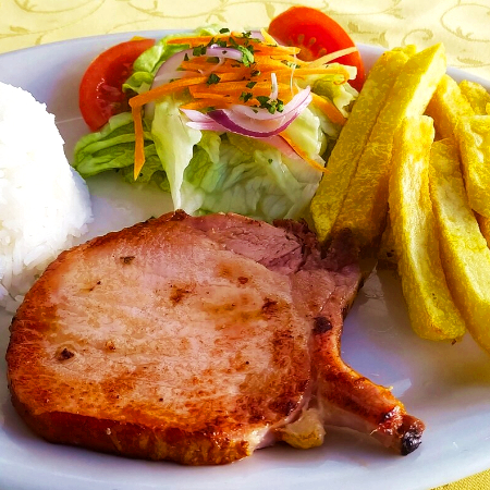Deliciosa chuleta acompañado de papas fritas arroz y ensalada