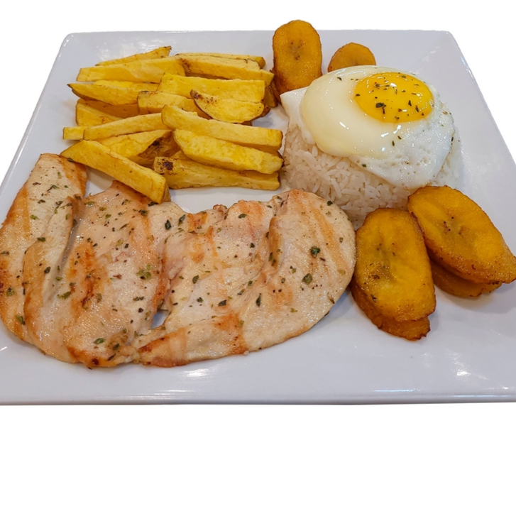Jugosa pechuga de 120 gr a la plancha con 200 gr papas fritas y 300 gr arroz