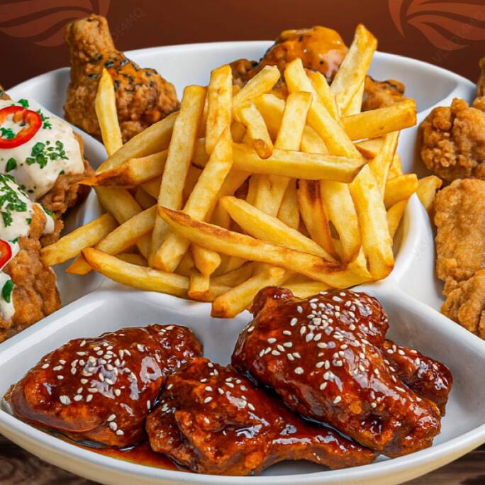 12 alitas en salsa a elección (2 sabores máximo) acompañada de papas fritas