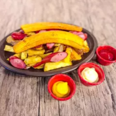 Puedes elegir 3 sabores como máximo, acompañado de papas fritas nativas.