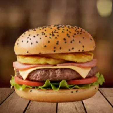 140 gr. De carne molida acompañados con jamón, queso edam y piña en rodaja.