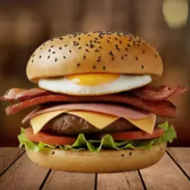 140 gr. De carne molida acompañados con jamón, queso edam, huevo, tocino en salsa BBQ y chorizo. La hamburguesa de la casa.