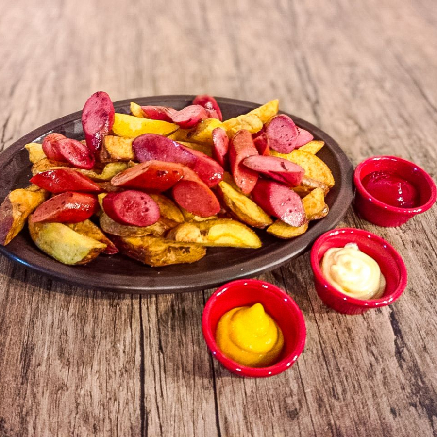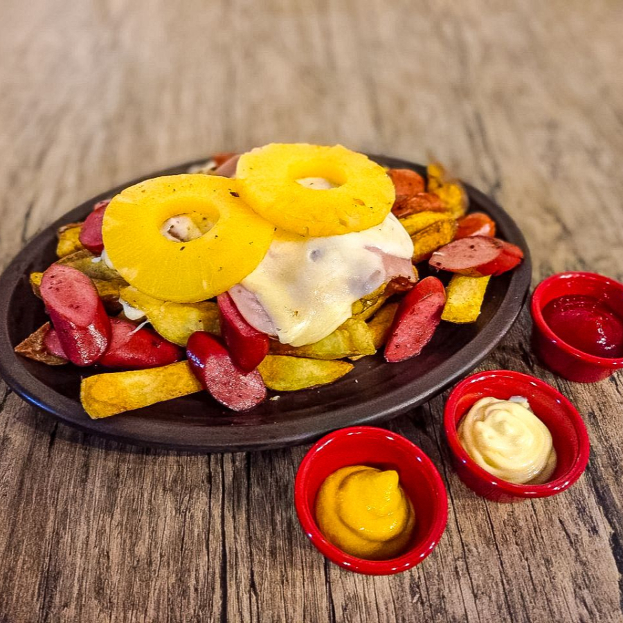Papas nativas acompañadas de salchicha ahumada, jamón, queso edam y piña.