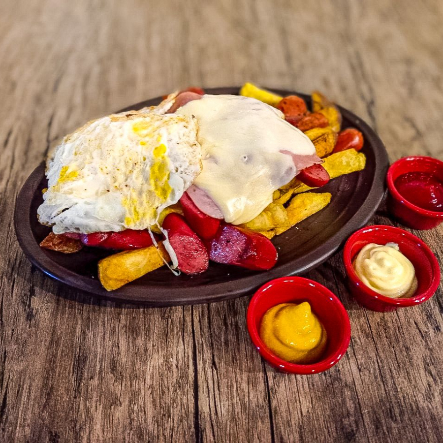Papas nativas acompañadas de salchicha ahumada, huevo, jamón y queso..