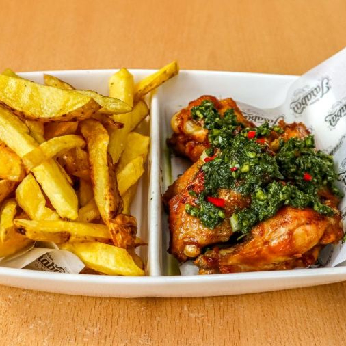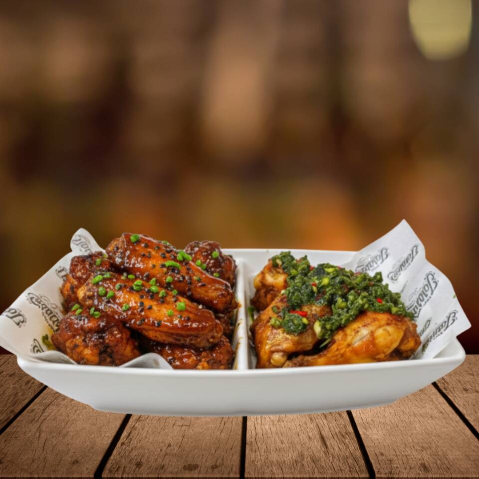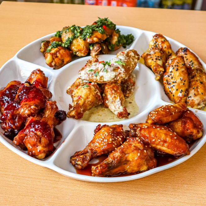Puedes elegir 5 sabores de alitas, acompañado de papas fritas nativas.