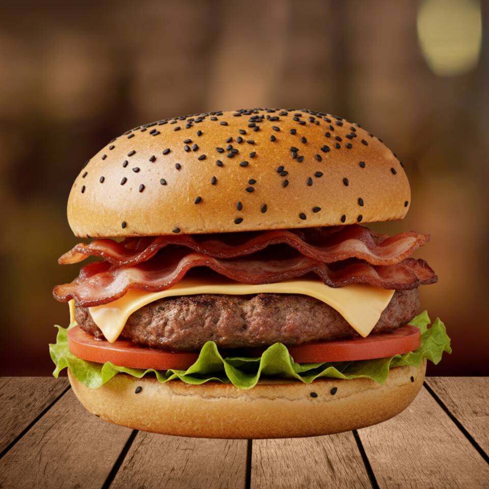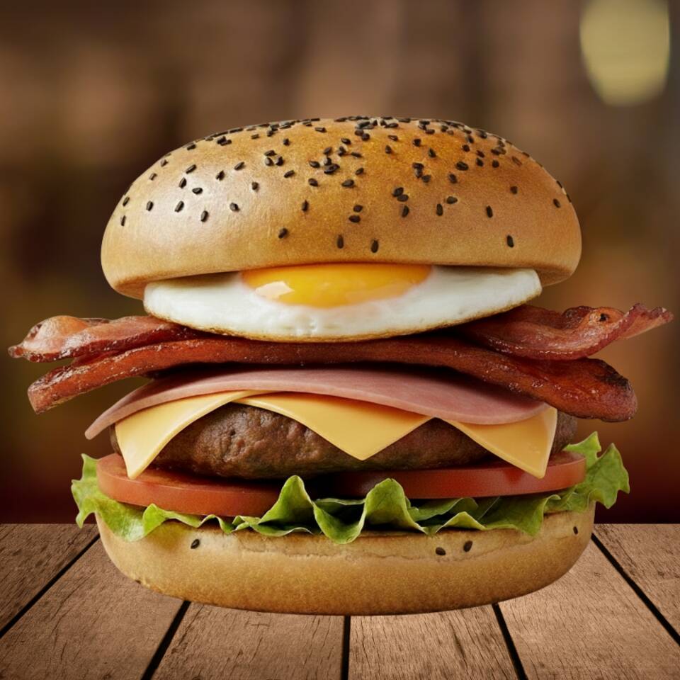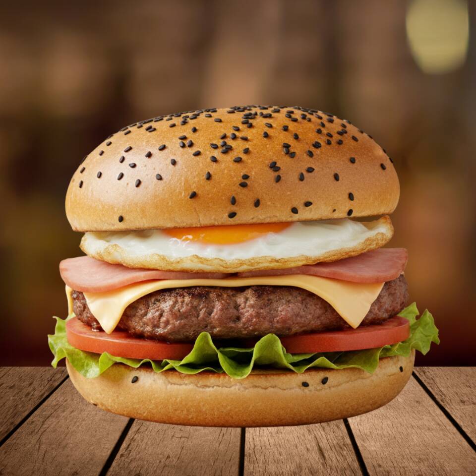 140 gr. De carne molida acompañados con jamón, queso edam, huevo, tocino en salsa BBQ y chorizo. La hamburguesa de la casa.