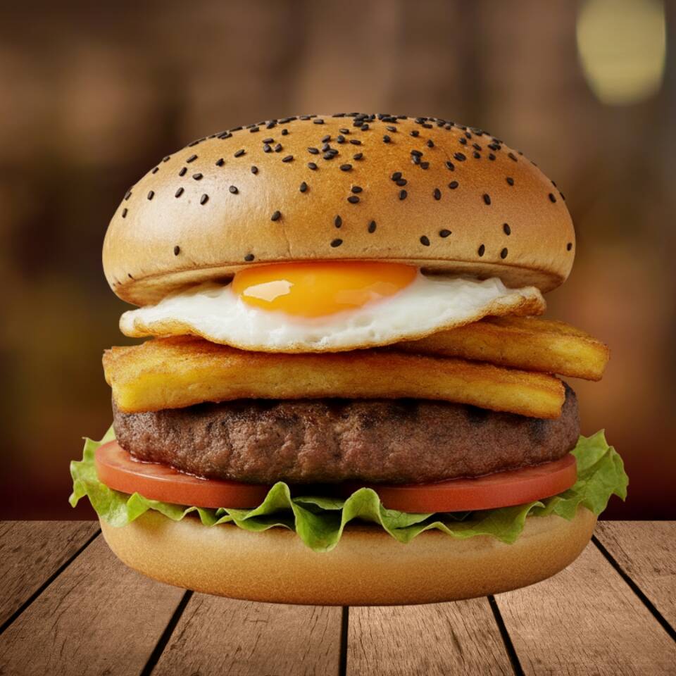 140 gr. De carne molida acompañados de plátano, y huevo en pan brioche.