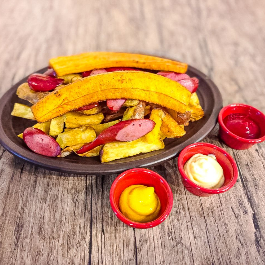 Papas nativas acompañadas de salchicha ahumada, platano y huevo.