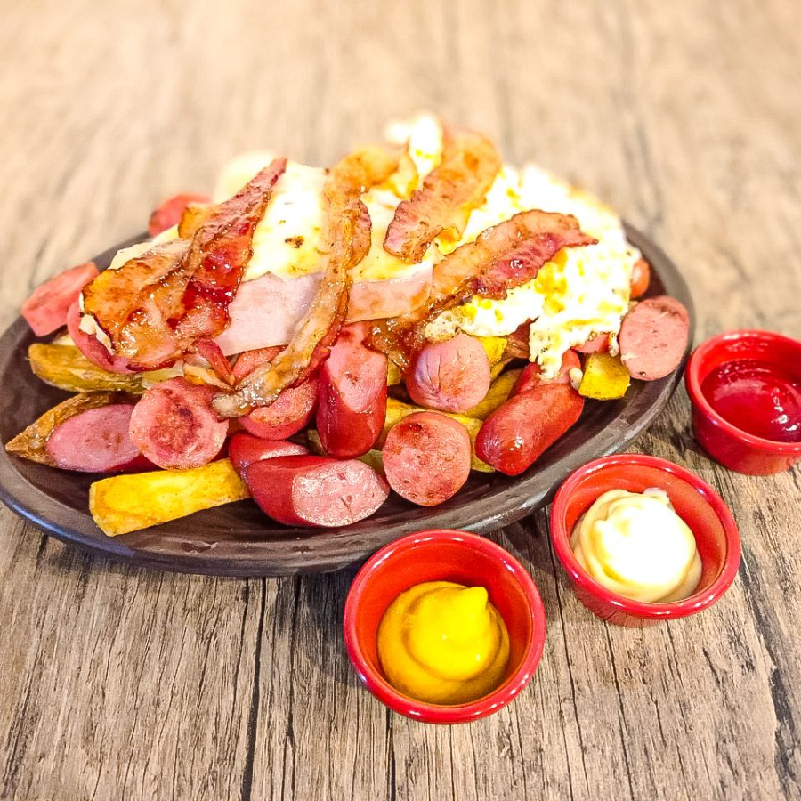 Papas nativas acompañadas de salchicha ahumada, tocino, queso y chorizo.