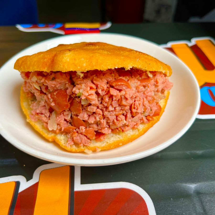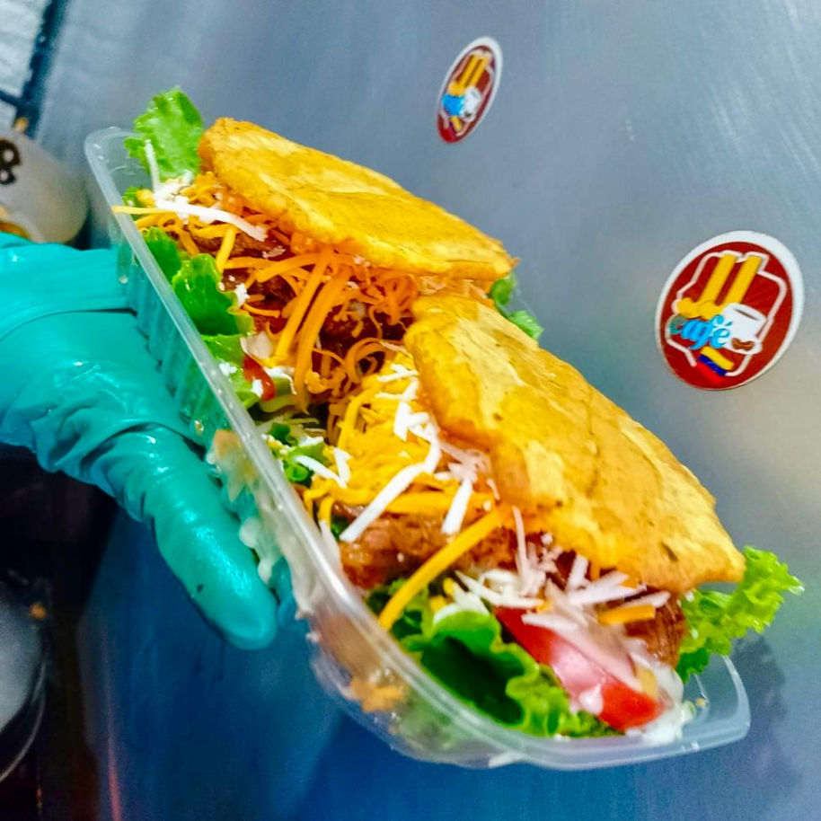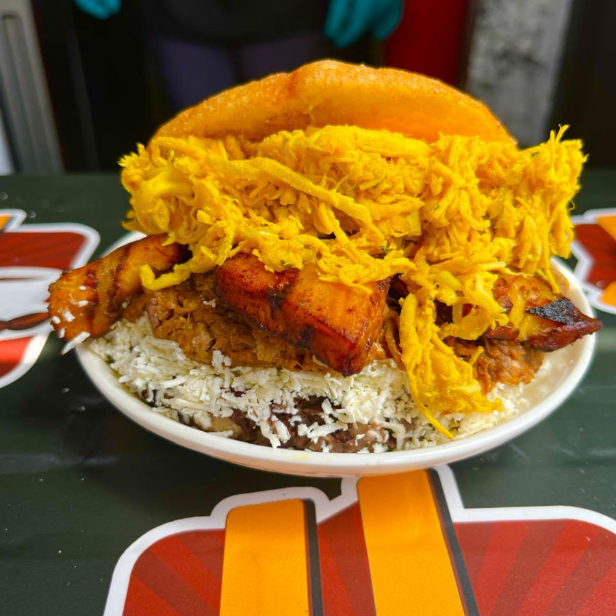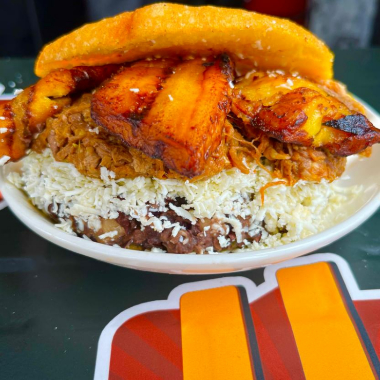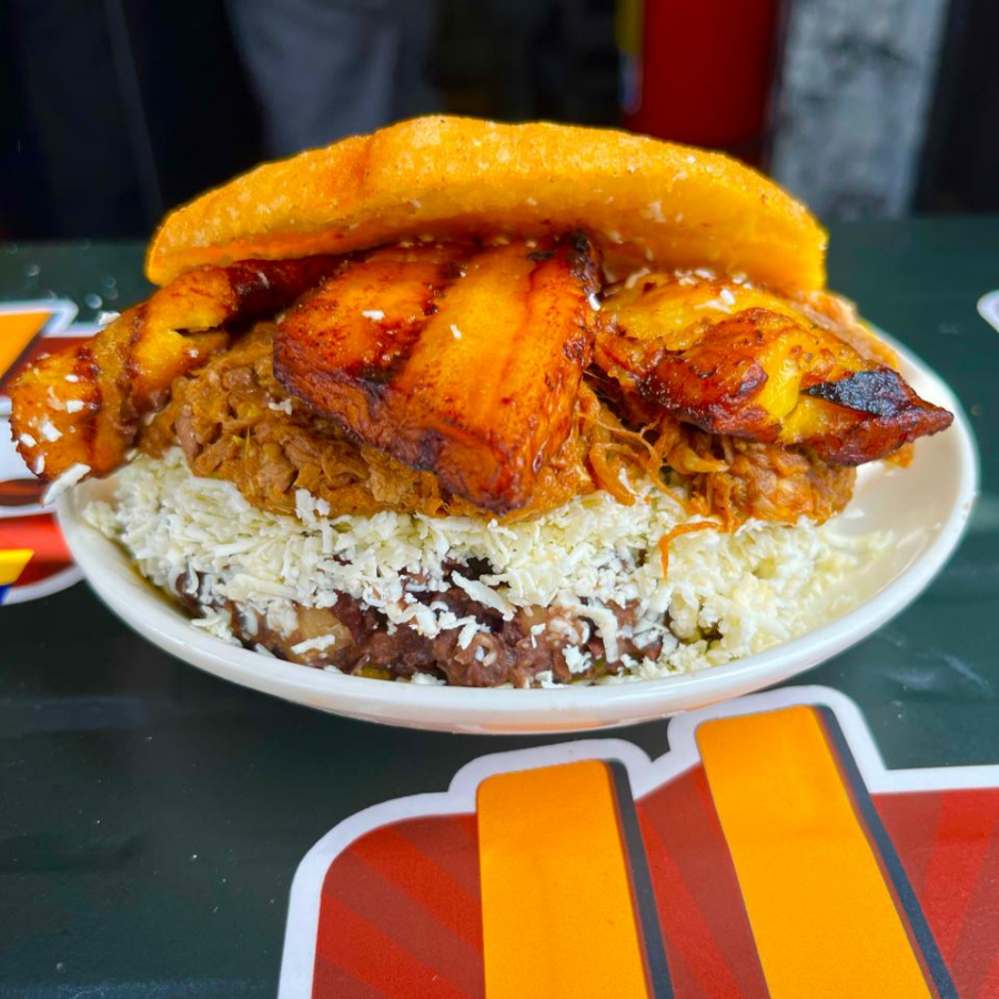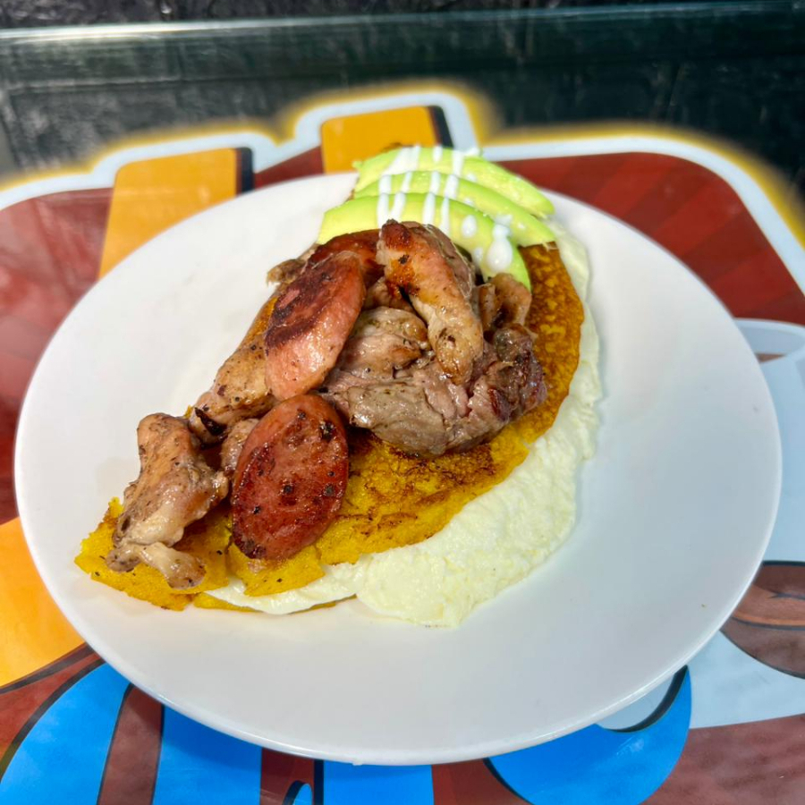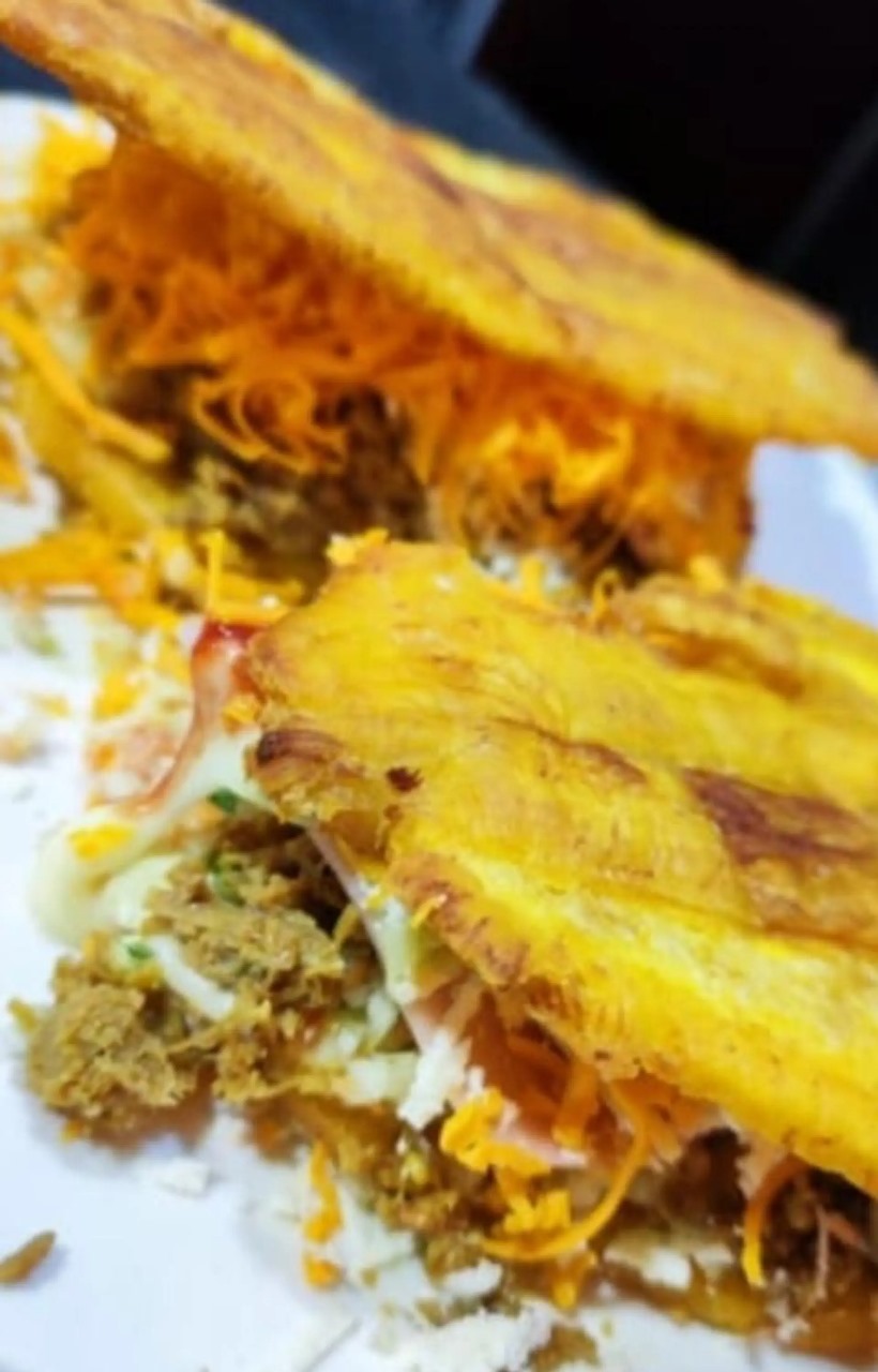 Patacón Triple de Carne Mechada, Pollo y Chorizo