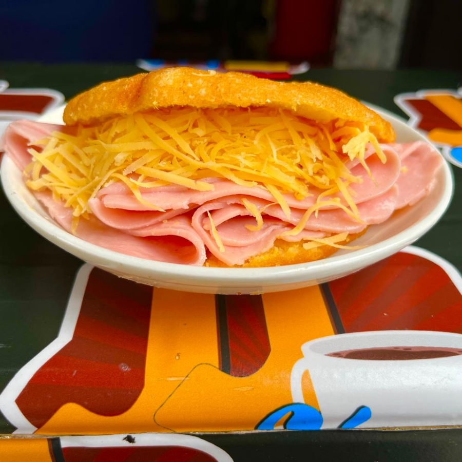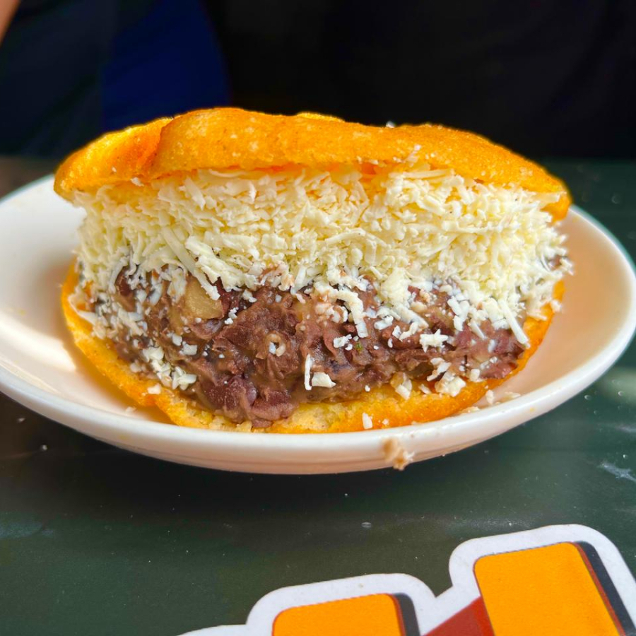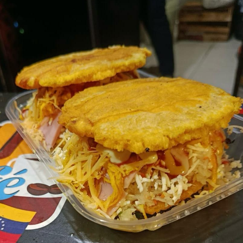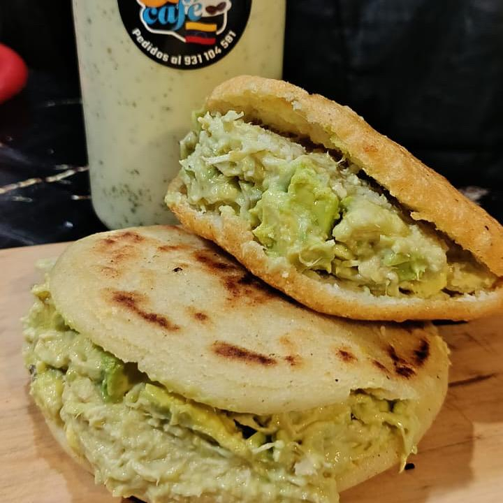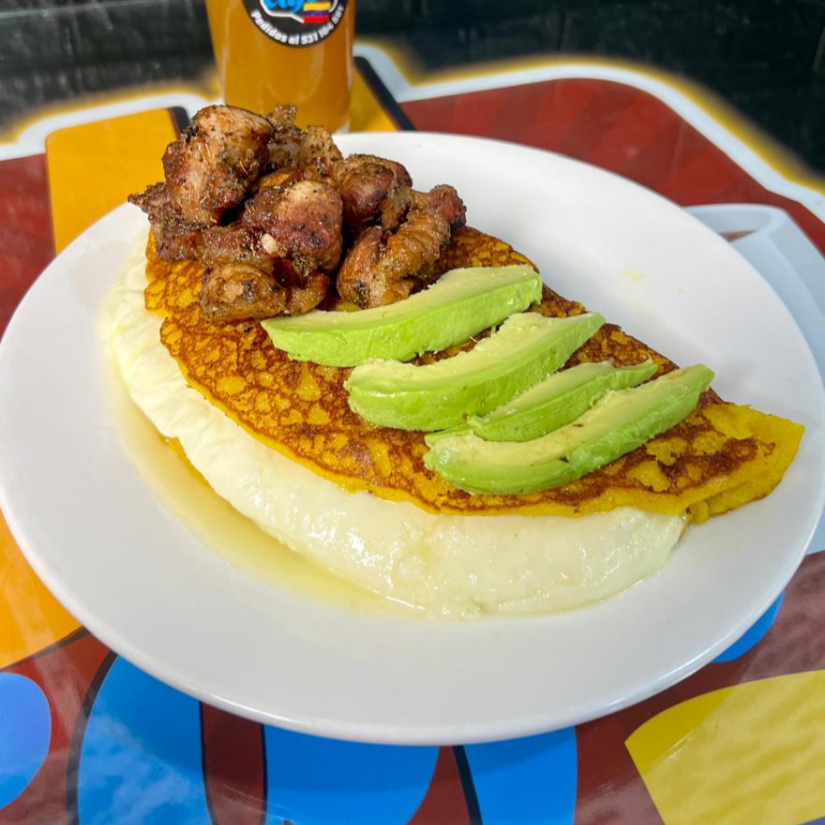 Arepa de maíz blanco rellena más contorno de su preferencia.