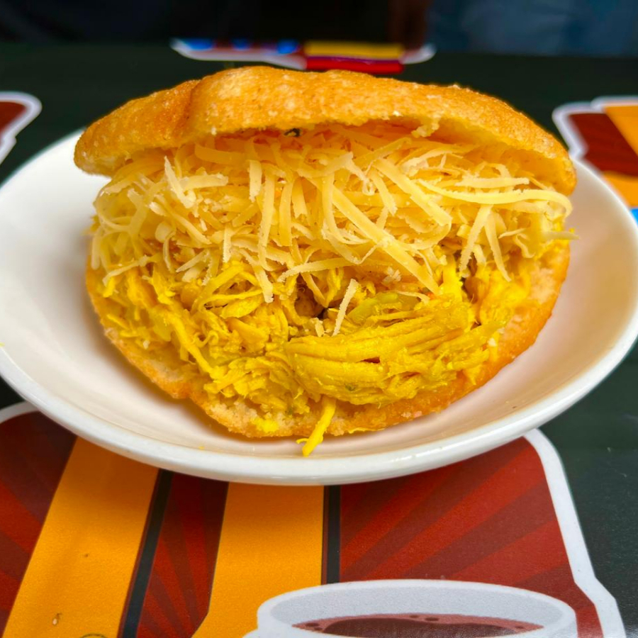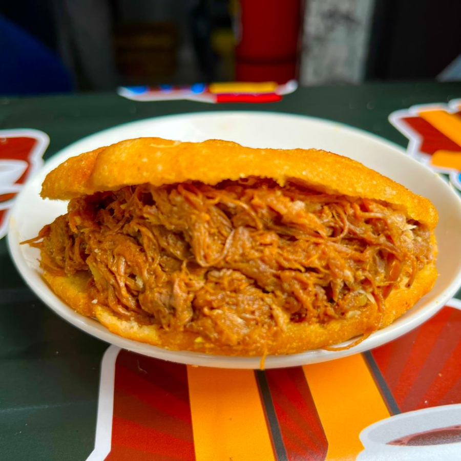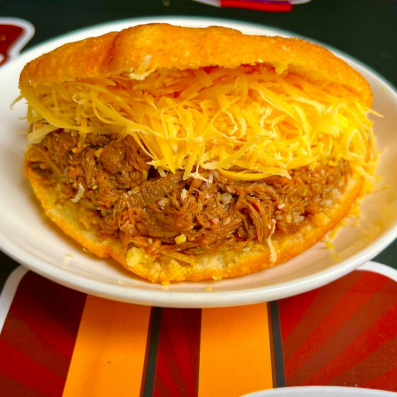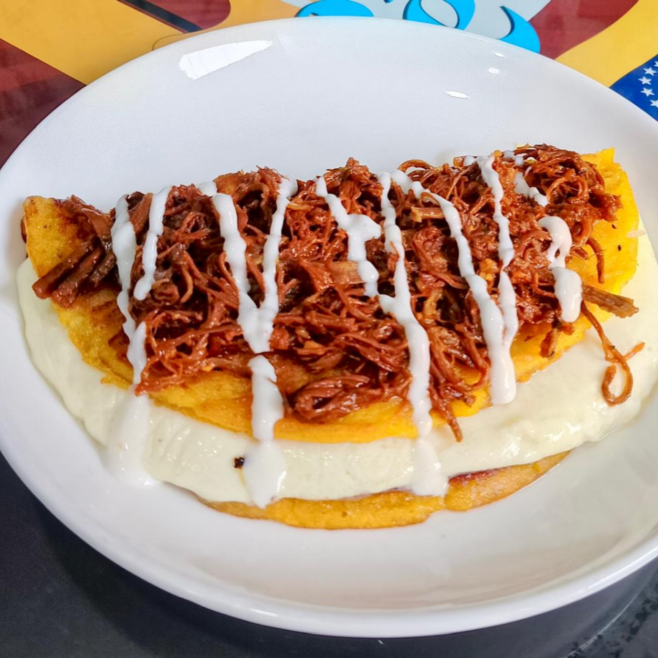 Cachapa de queso de mano y queso llanero con carne mechada.