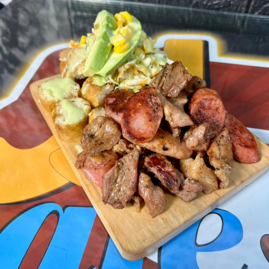 Carne de res, pechuga de pollo, chorizo ahumado, ensalada, bollito y palta.