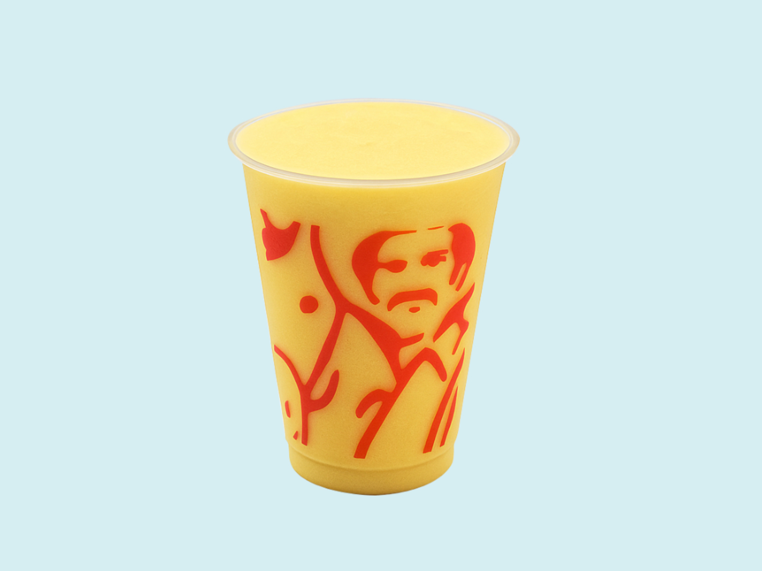 Bebida fría, preparada con mezcla láctea, hielo y pulpa de mango.