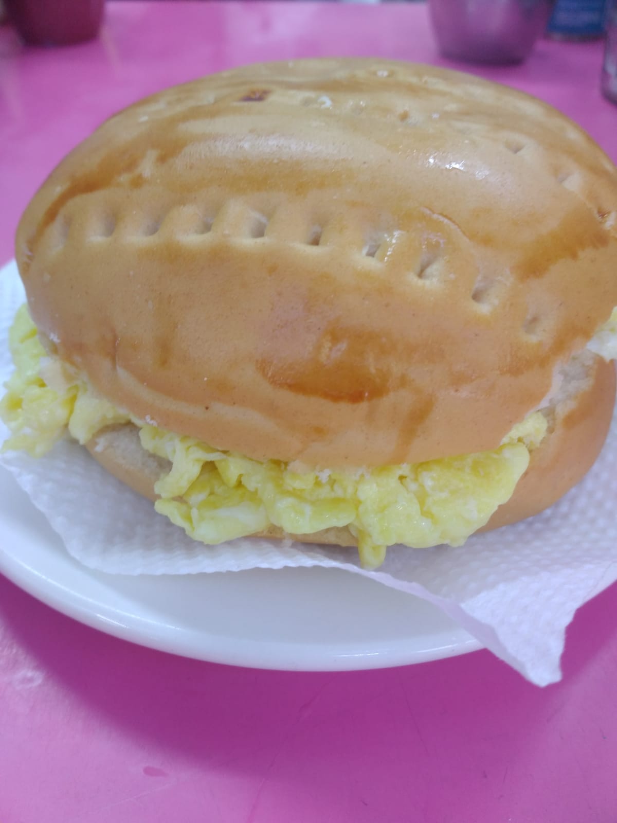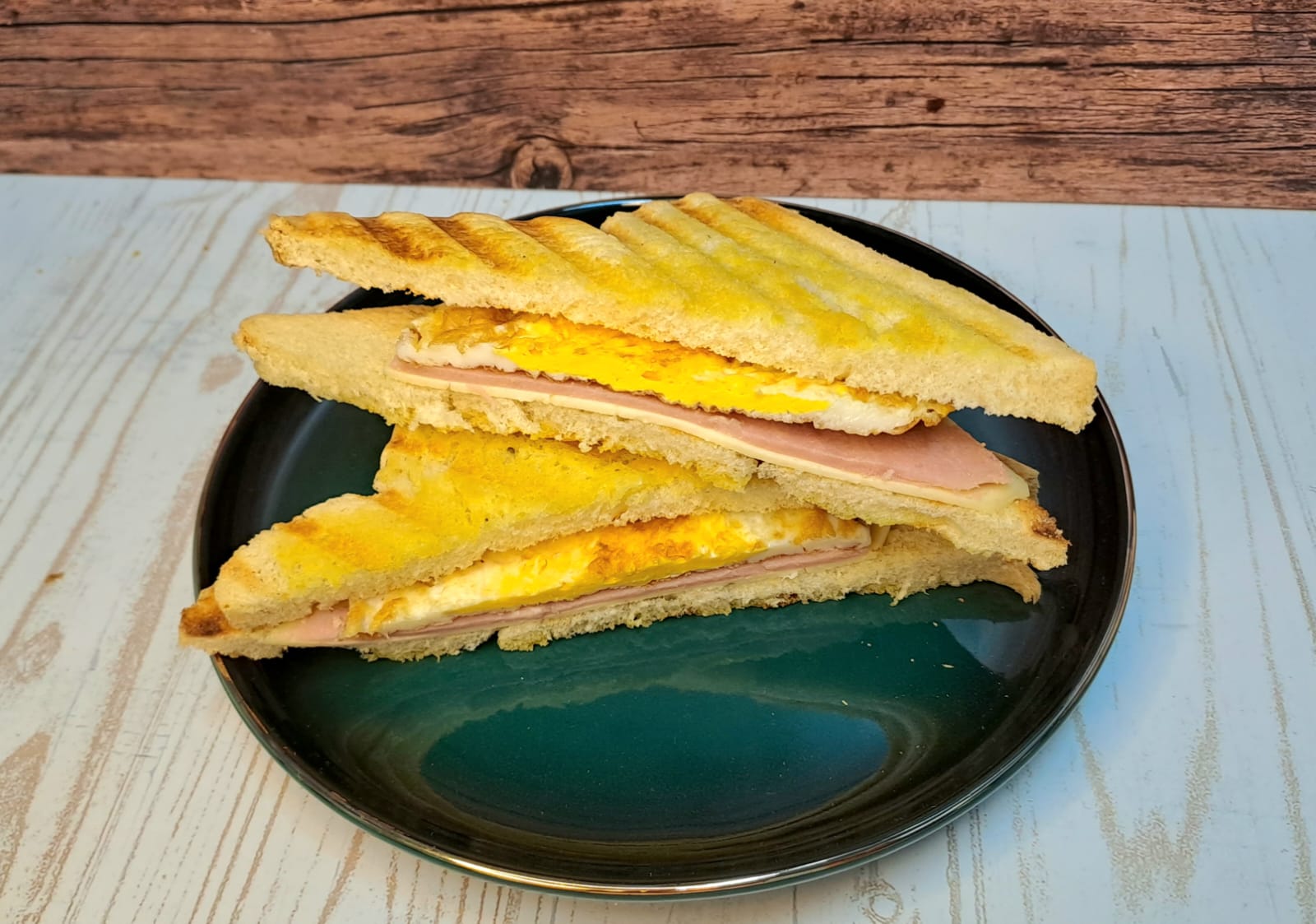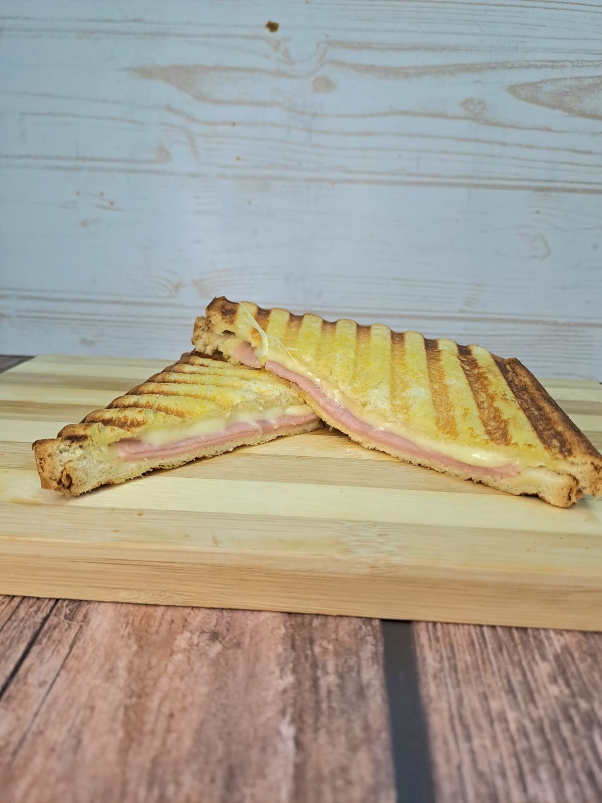 2 pan de molde dorado con mantequilla a la plancha relleno de queso dambo, jamón inglés y huevo.