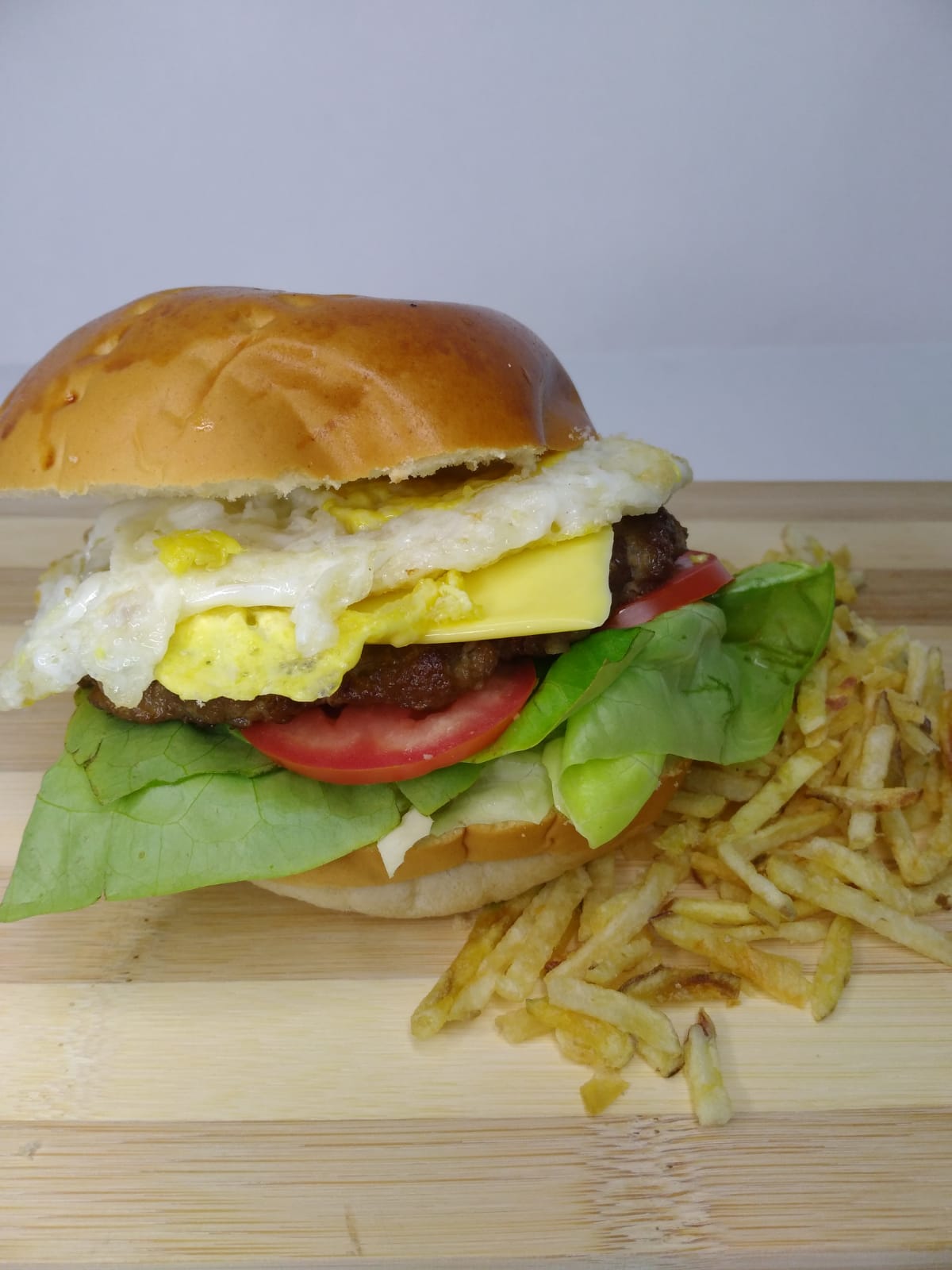 Hamburguesa de carne artesanal, lechuga, tomate, queso fundido, huevo y cremas.
