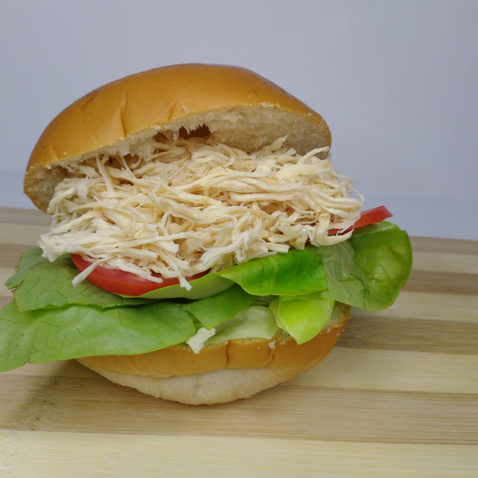 Lechuga, tomate, pollo deshilachado montado con queso dambo y jamon ingles.