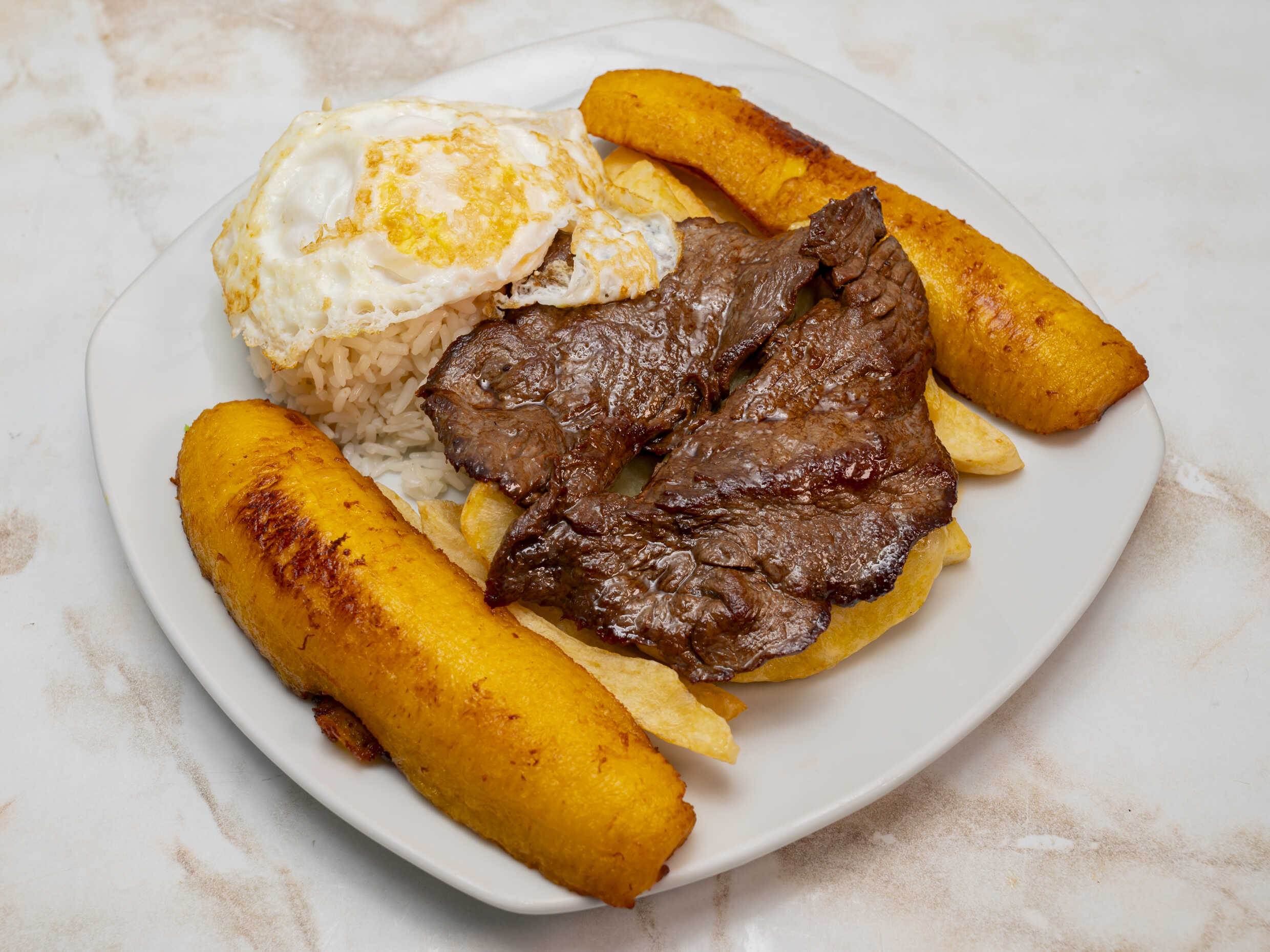 Bistec - Papas Fritas - Plátano Frito - Huevo - Arroz