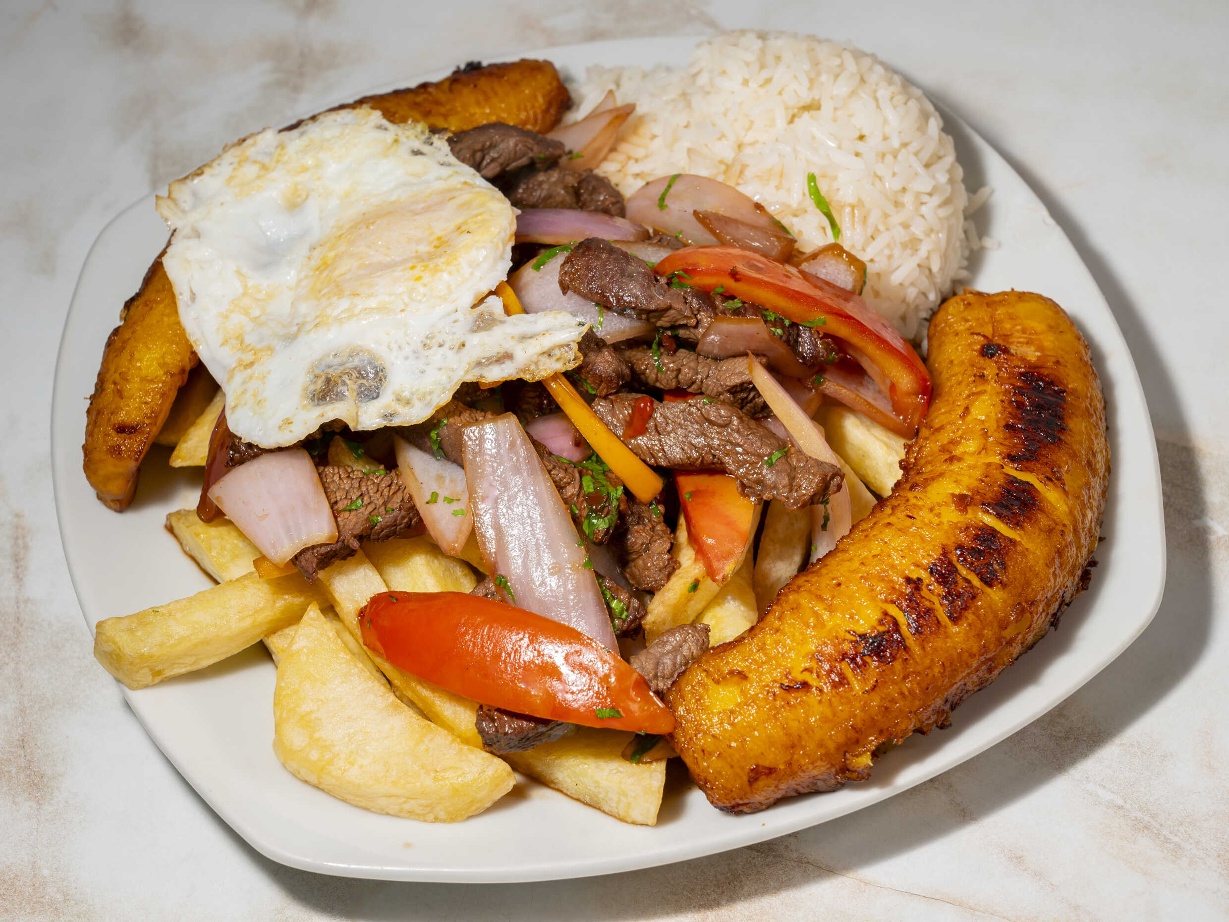 Lomo Saltado - Arroz - Papas Fritas - Huevo - Plátano Frito