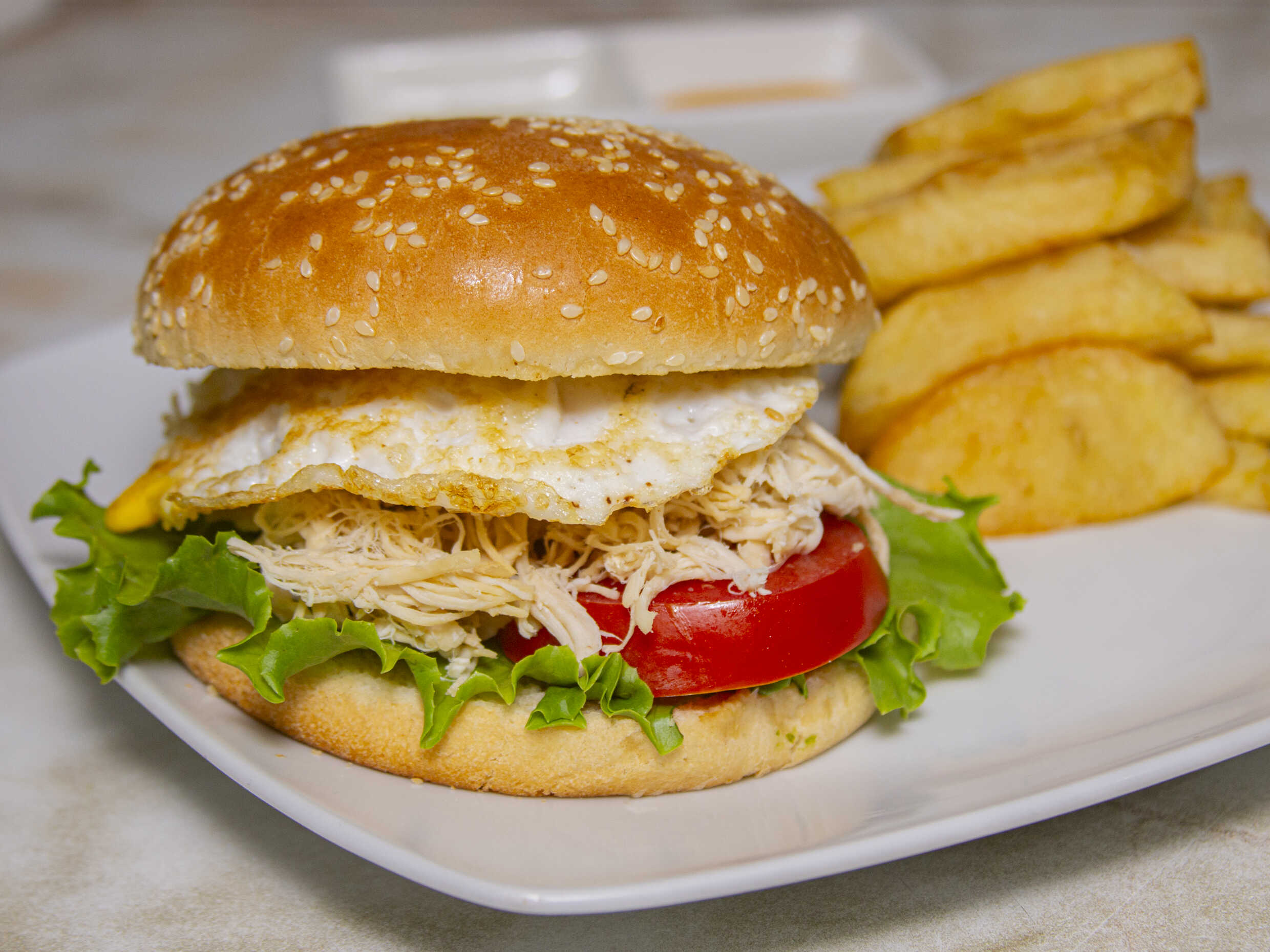 Pollo Deshilachado / Huevo / Papas / Lechuga / Tomate / Cremas