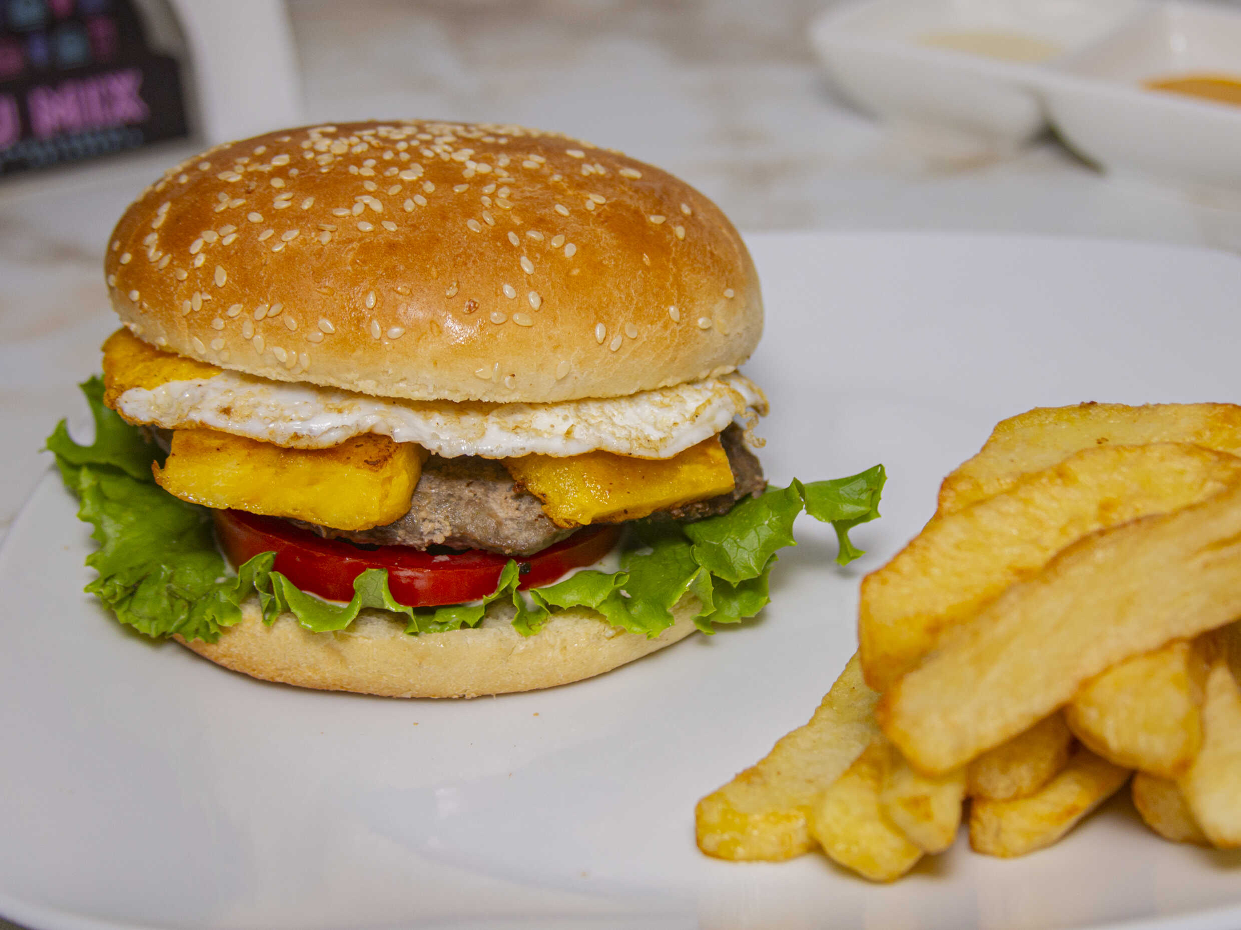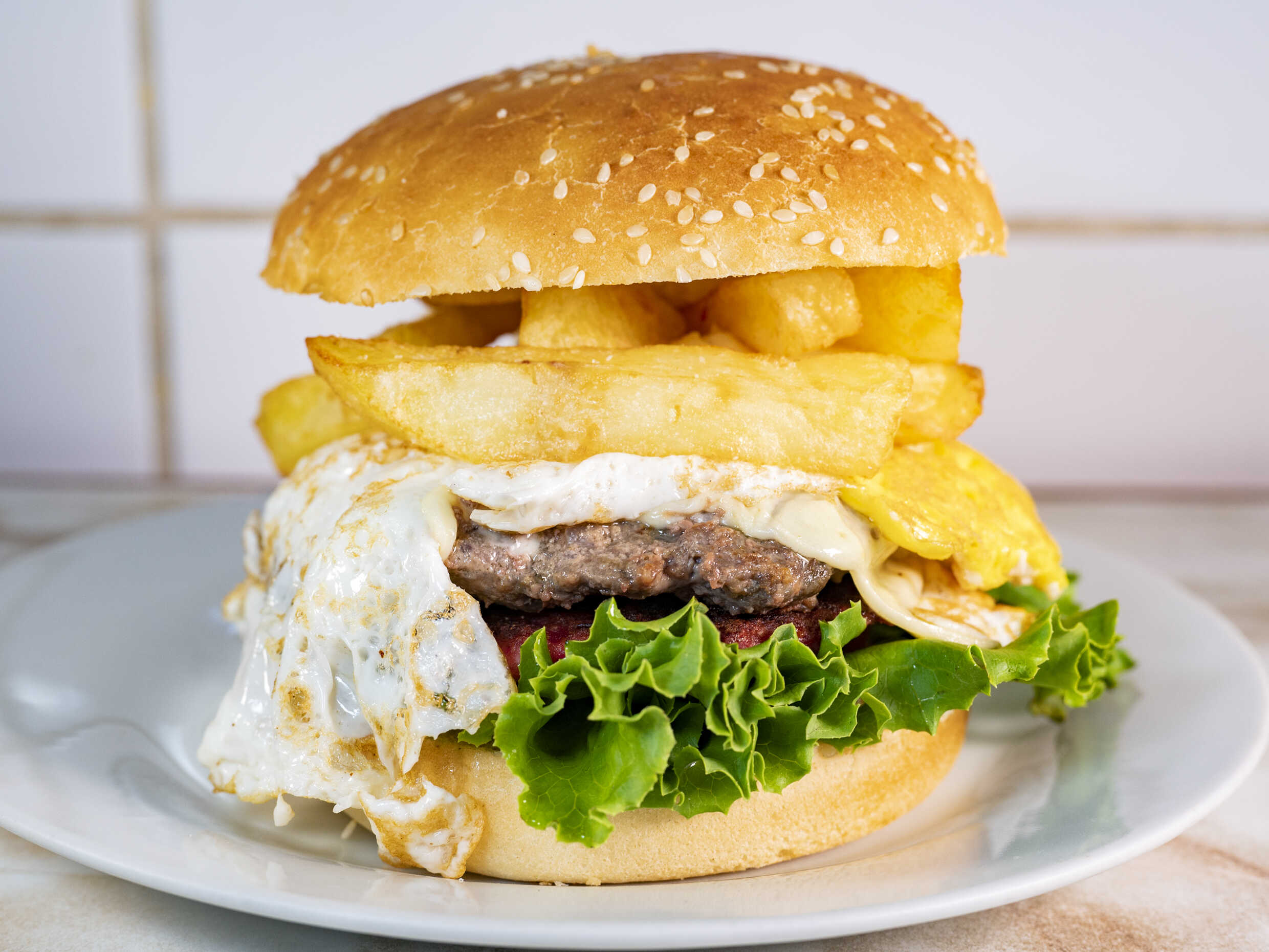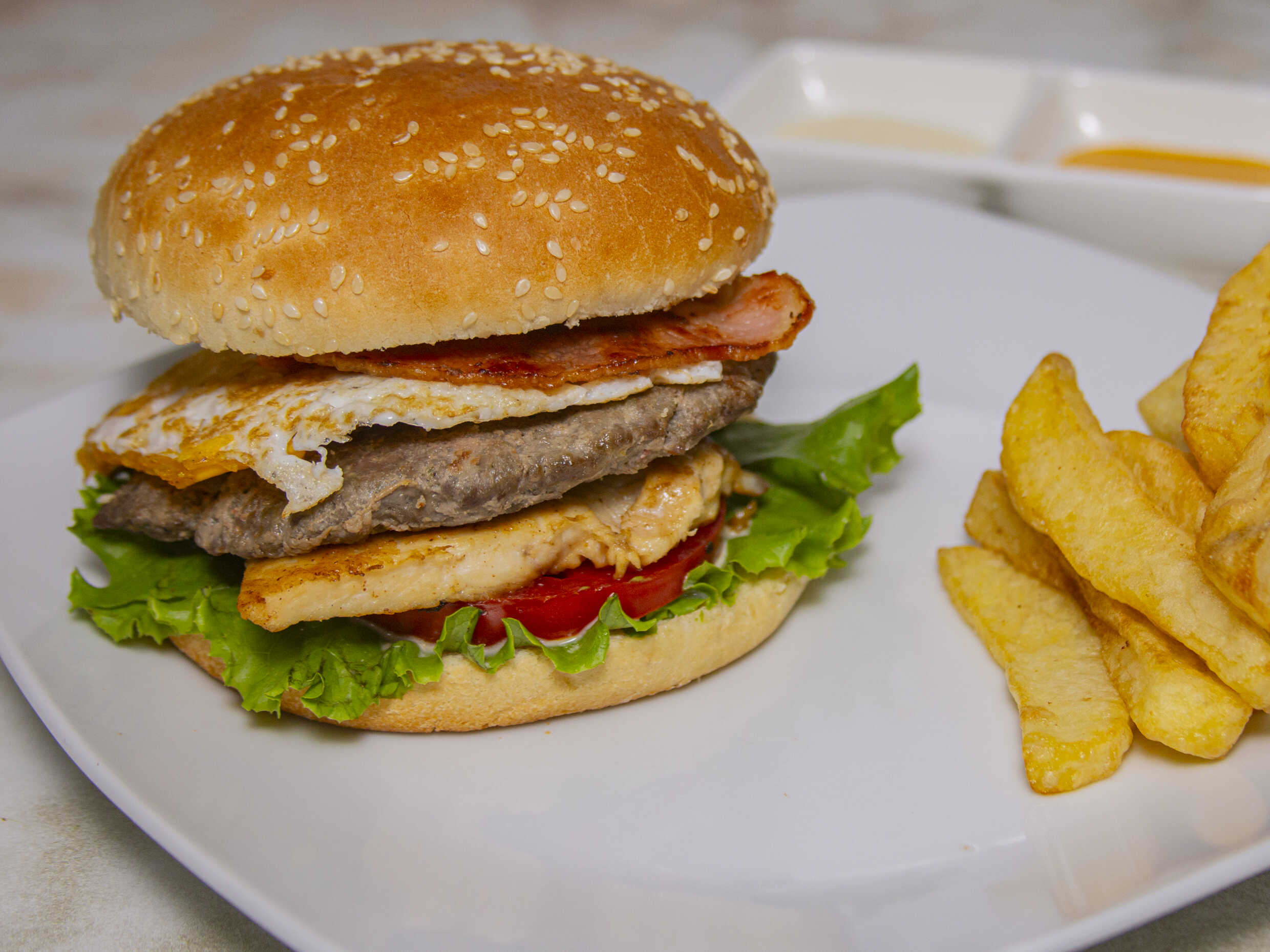 Hamburguesa casera / Huevo / Plátano / Papas / Tomate / Lechuga / Cremas