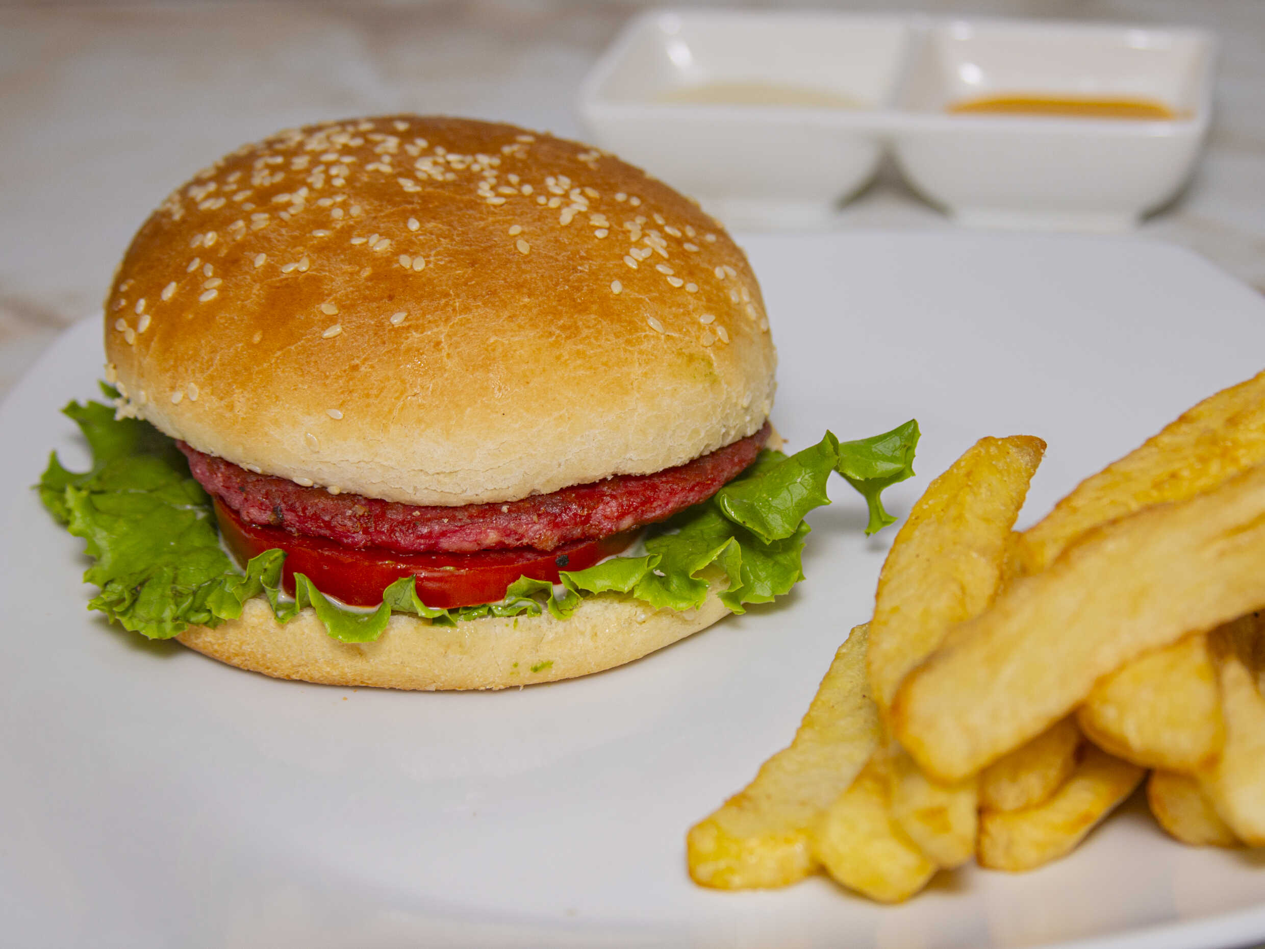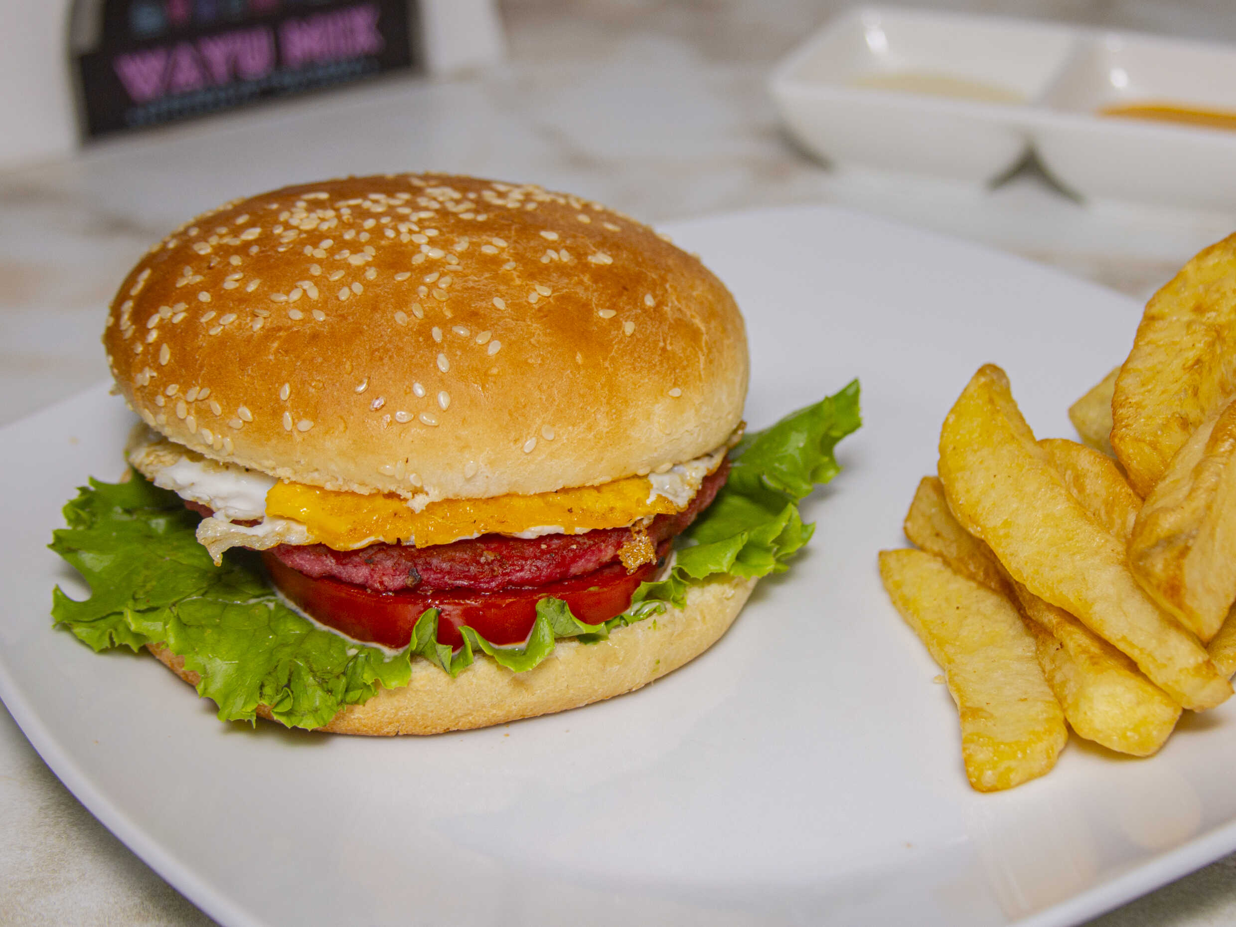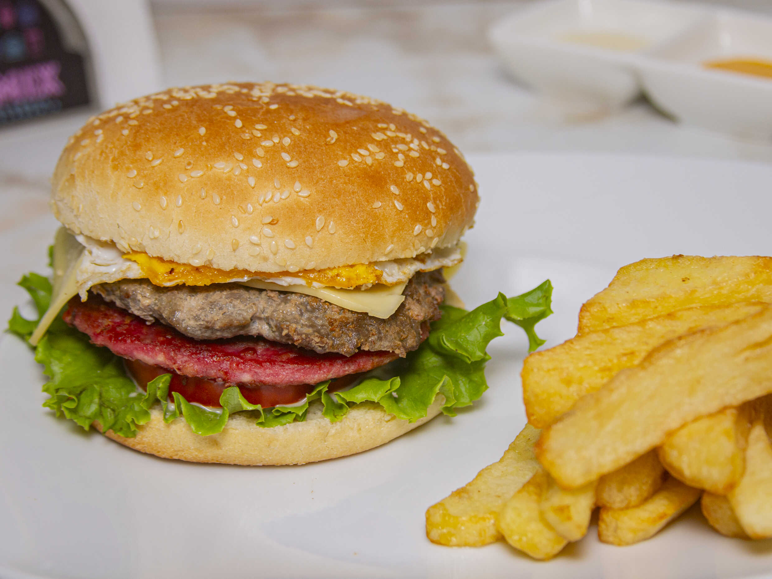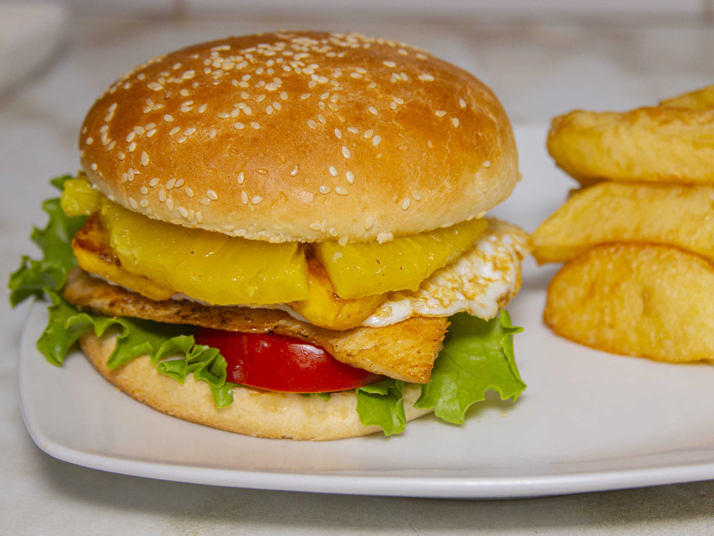 Hamburguesa casera / Huevo / Plátano / Papas / Tomate / Lechuga / Cremas