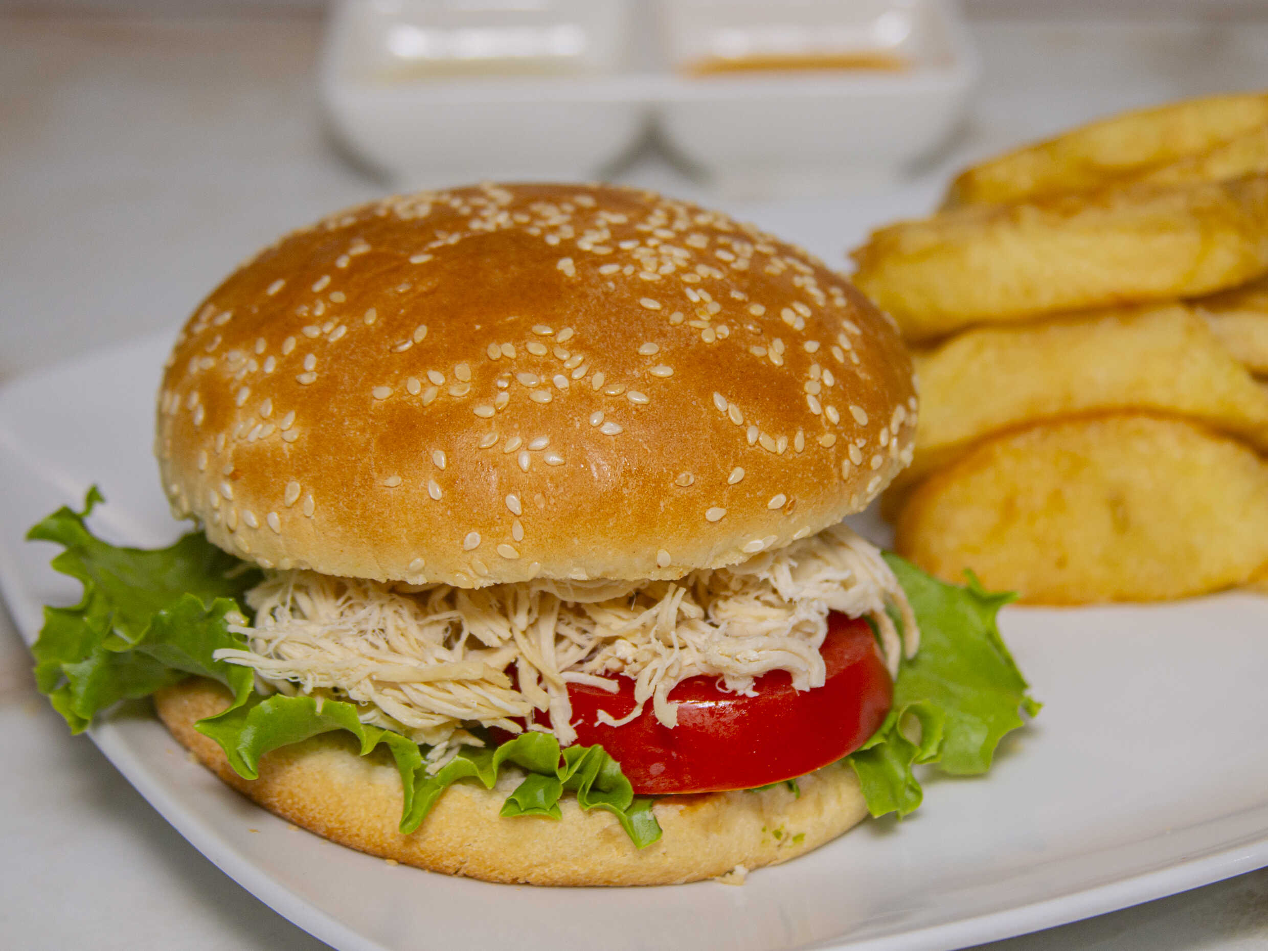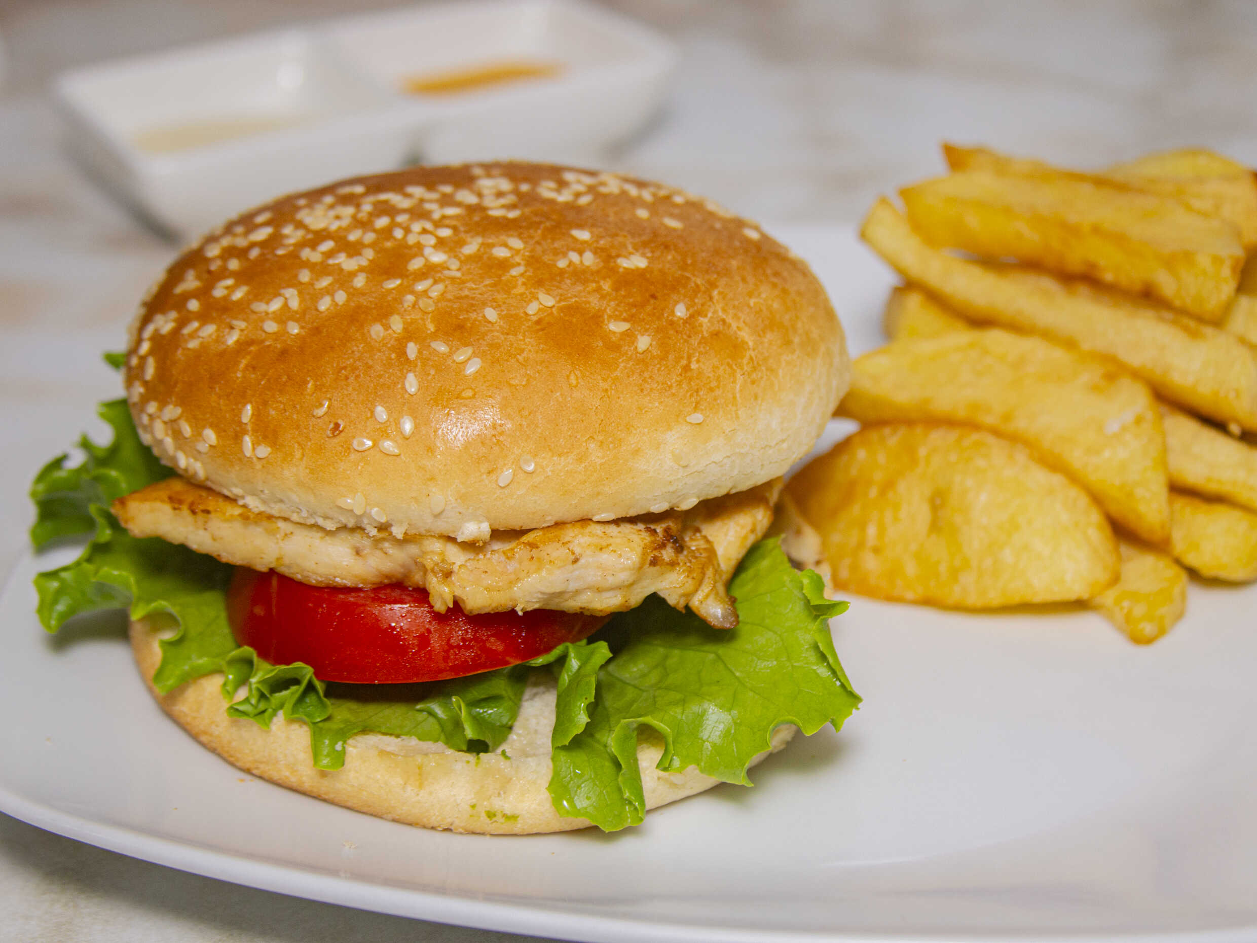 Filete de pollo / Papas / Lechuga / Tomate / Cremas