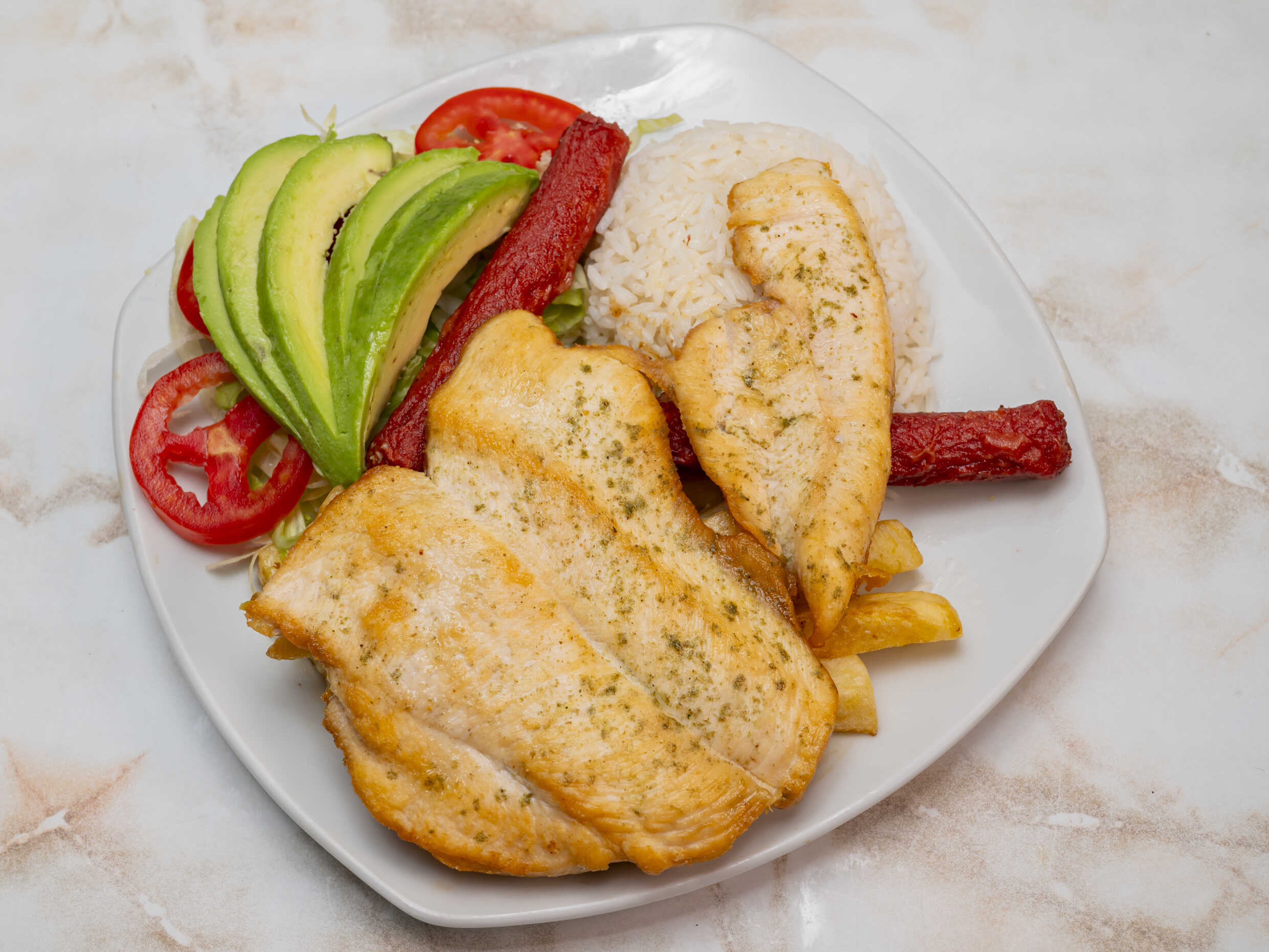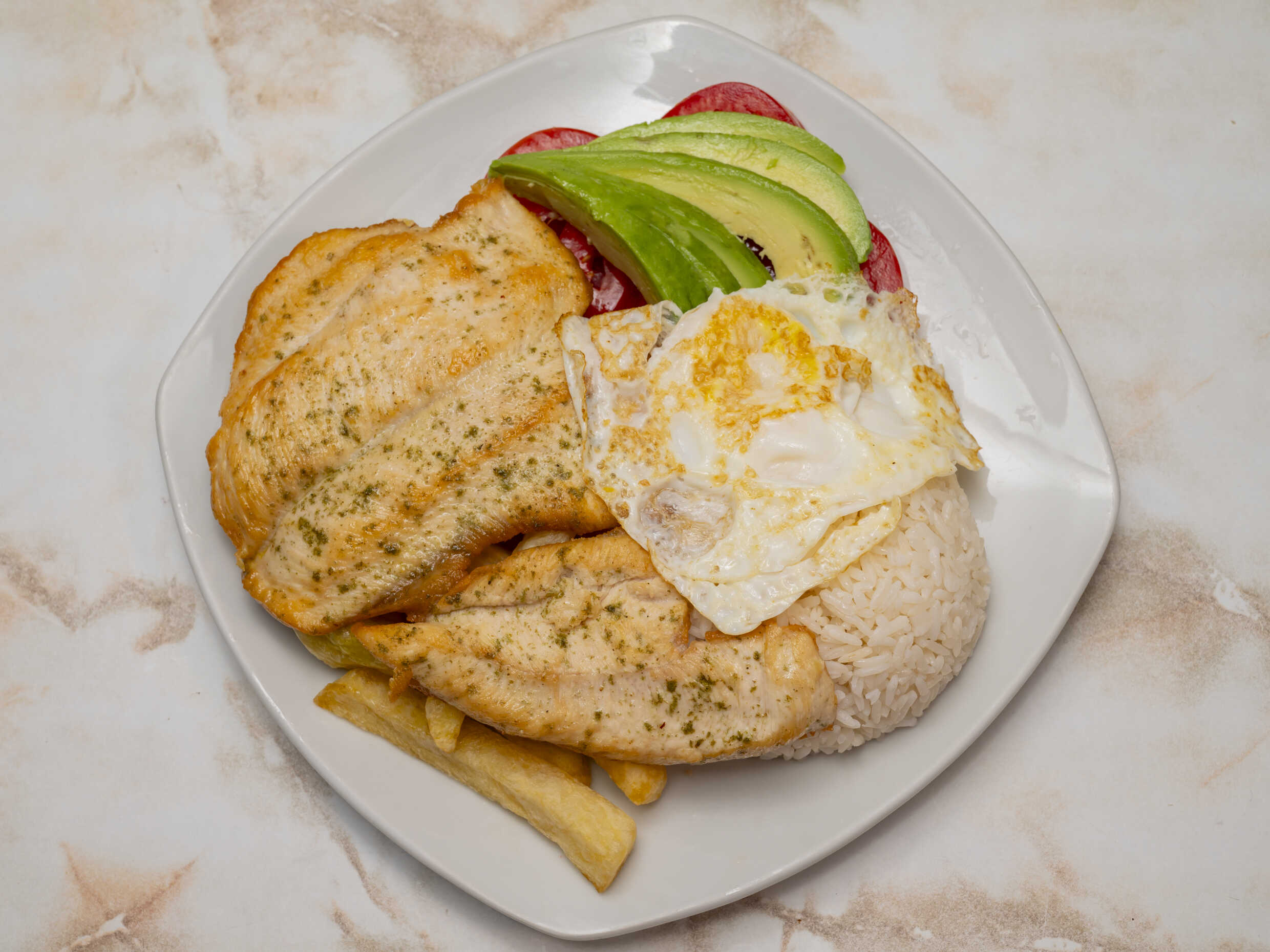 Filete de pollo - Papas Fritas - Huevo - Arroz - Palta - Tomate - Pepino