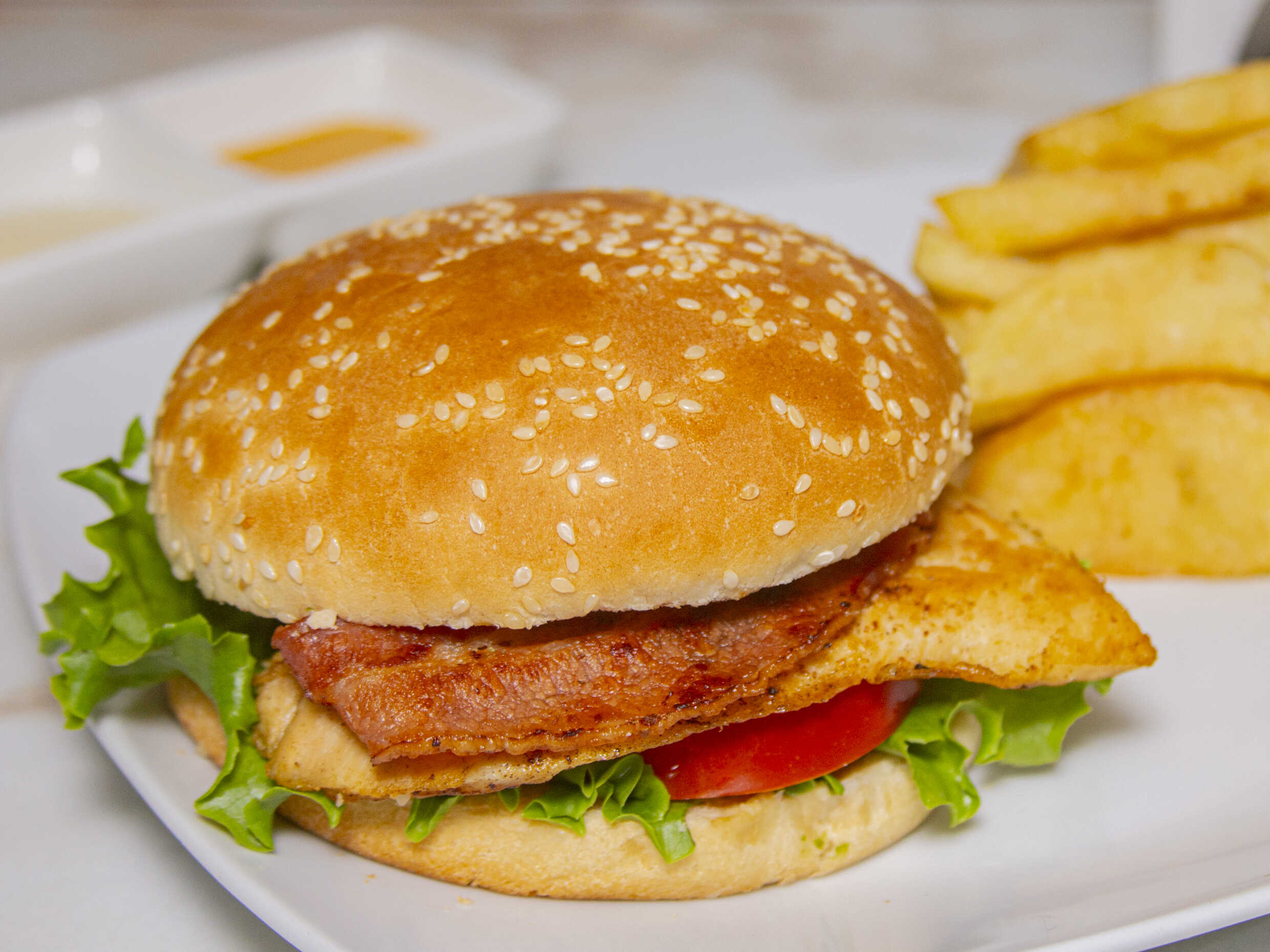 Filete de pollo / Tocino / Papas / Lechuga / Tomate / Cremas