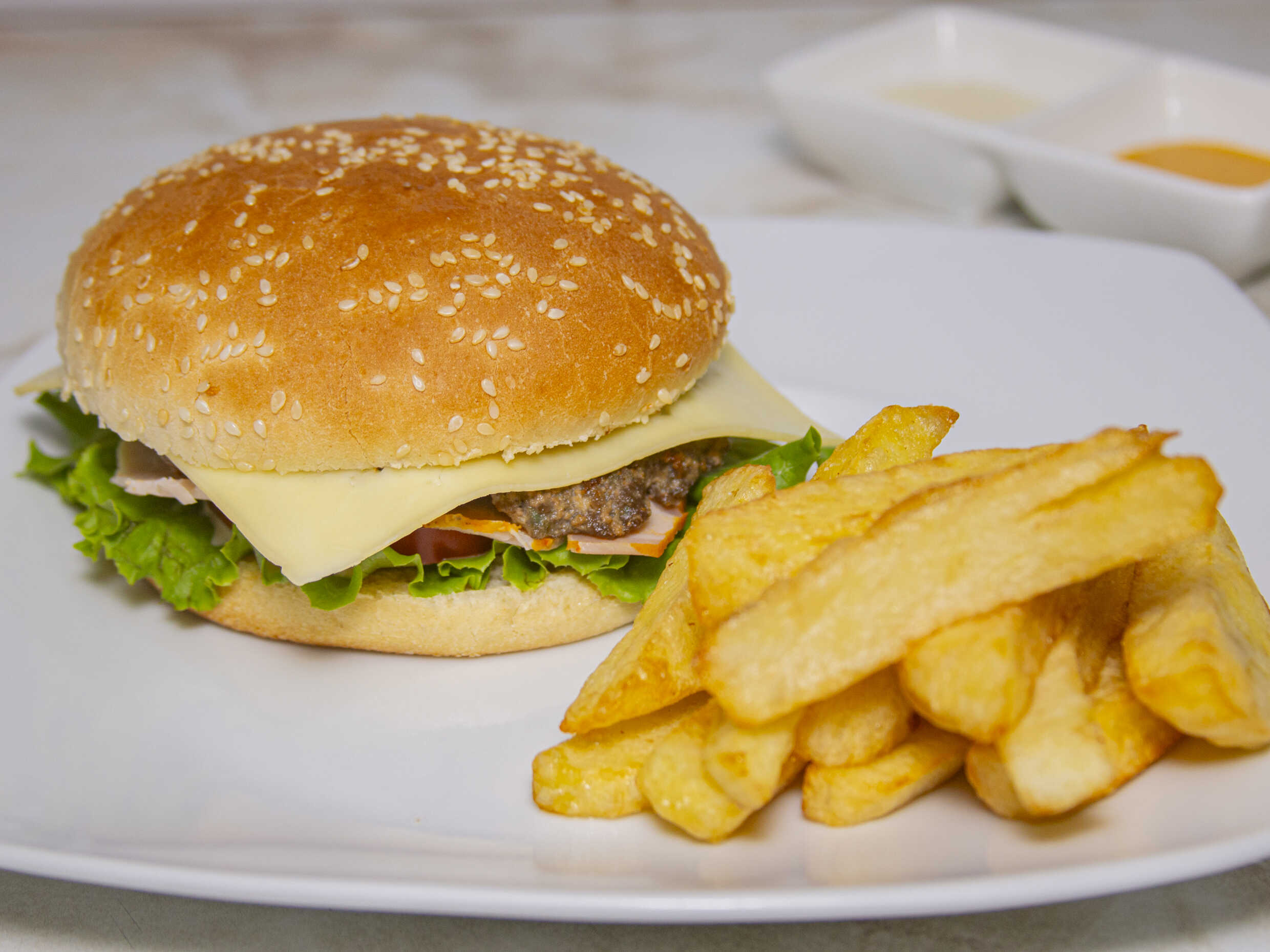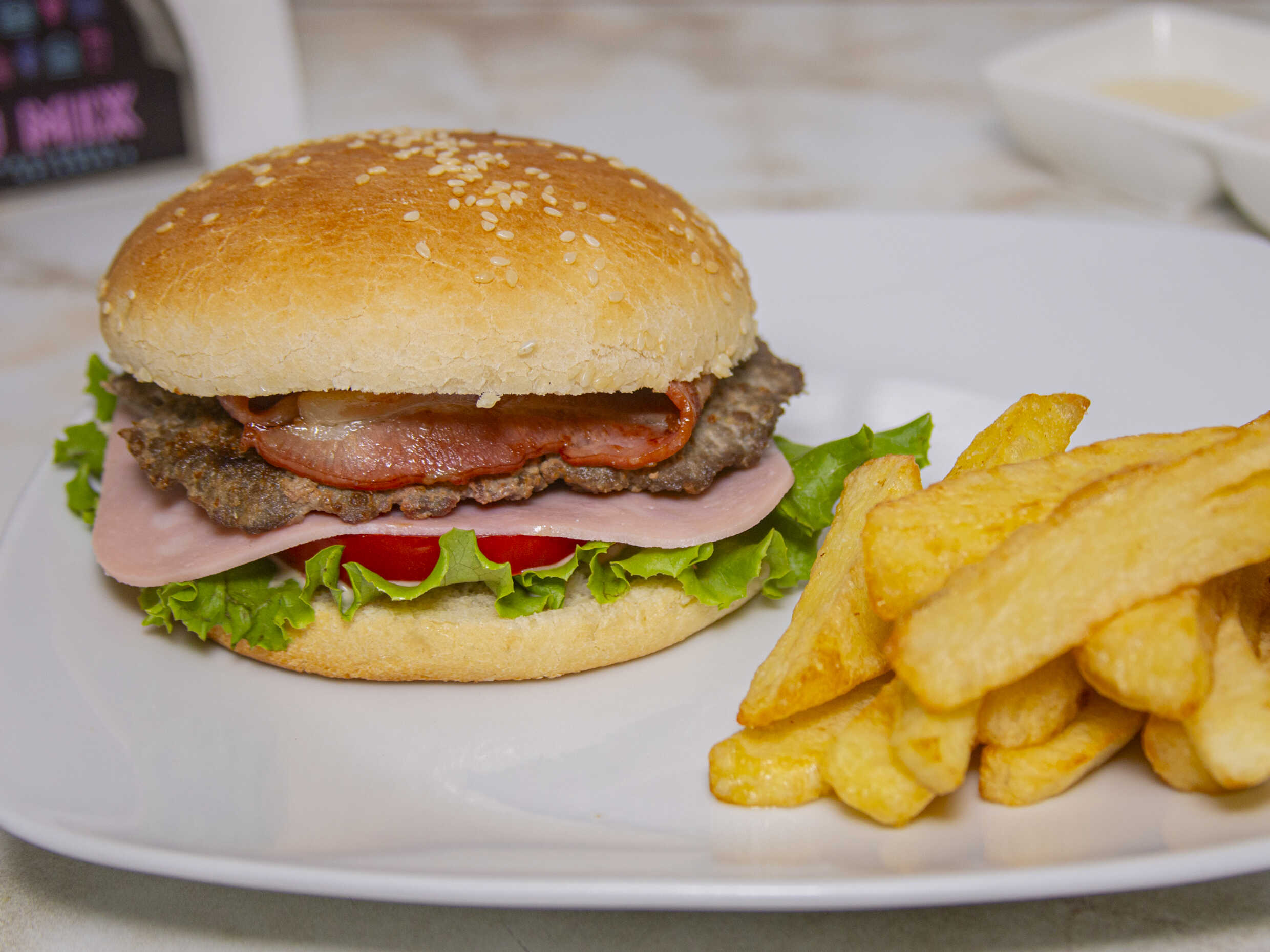 Hamburguesa casera / Jamón del país / Queso / Papas / Tomate / Lechuga / Cremas