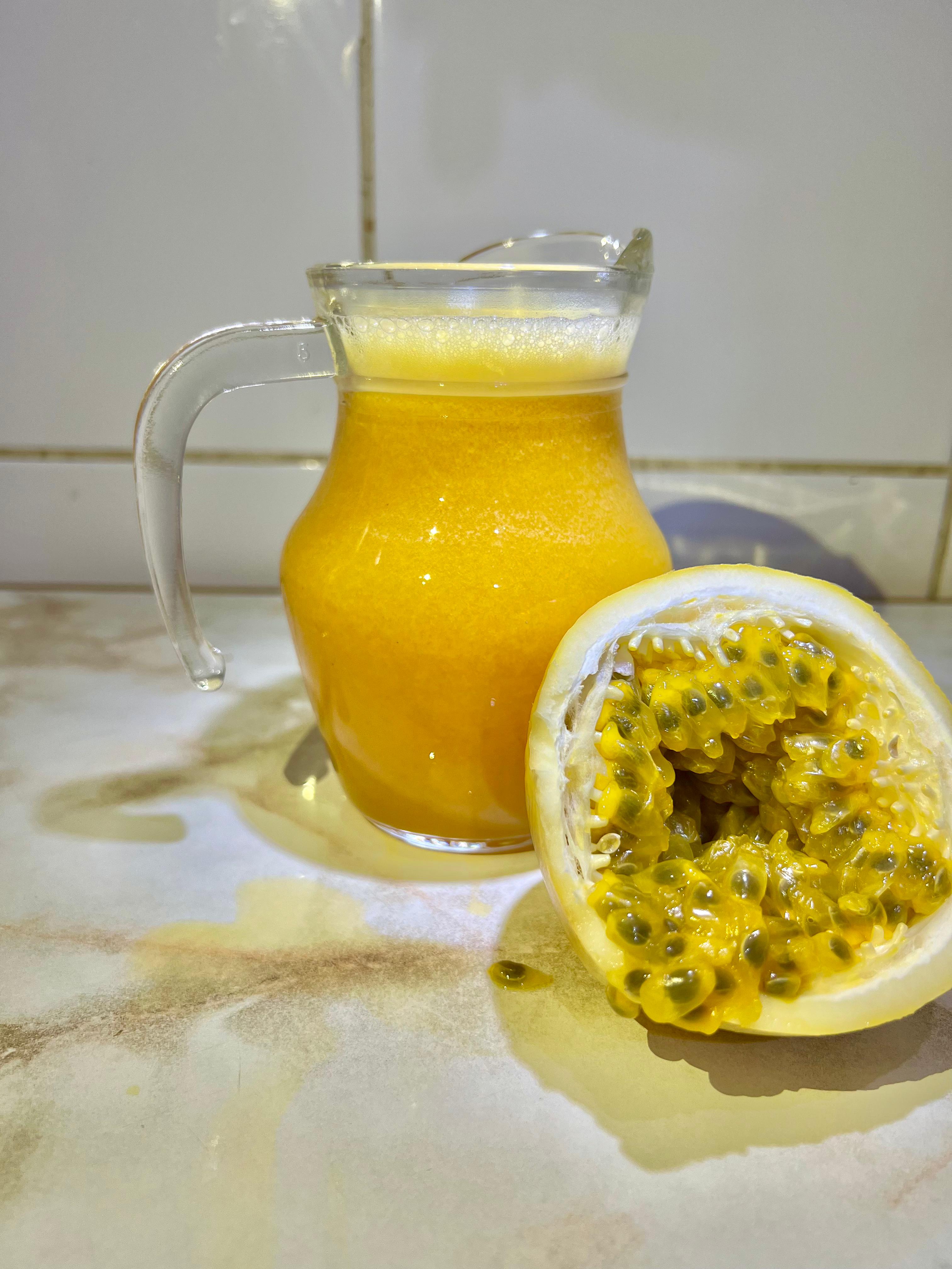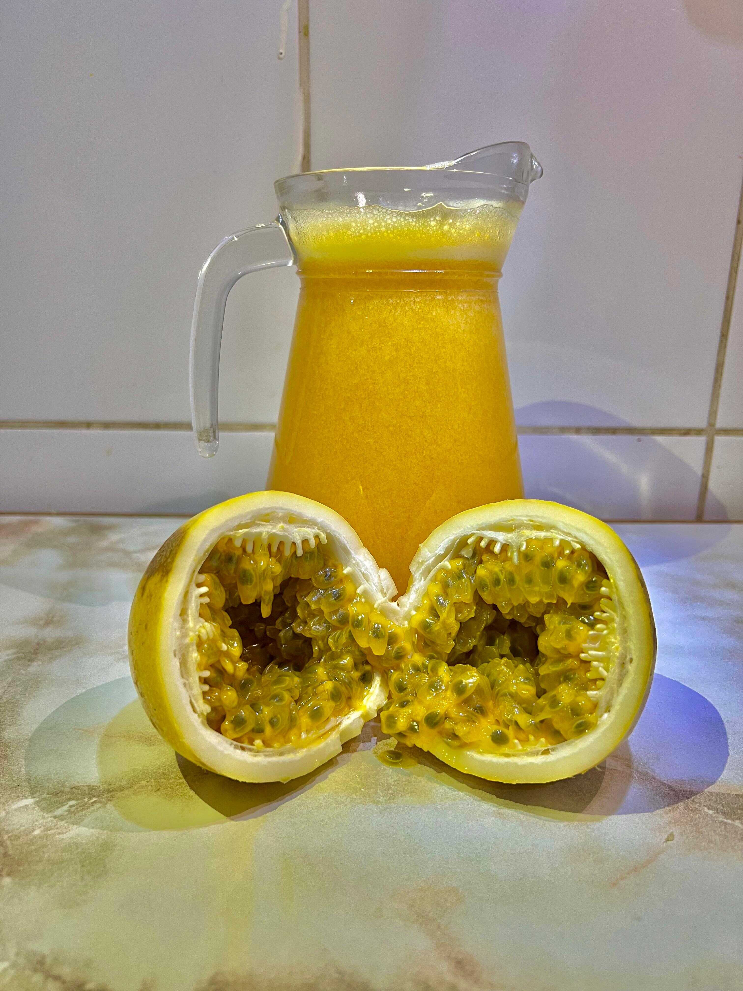 1 Litro de refrescante y deliciosa bebida de maracuyá, agua fresca y azúcar. Elige entre helada o sin helar.