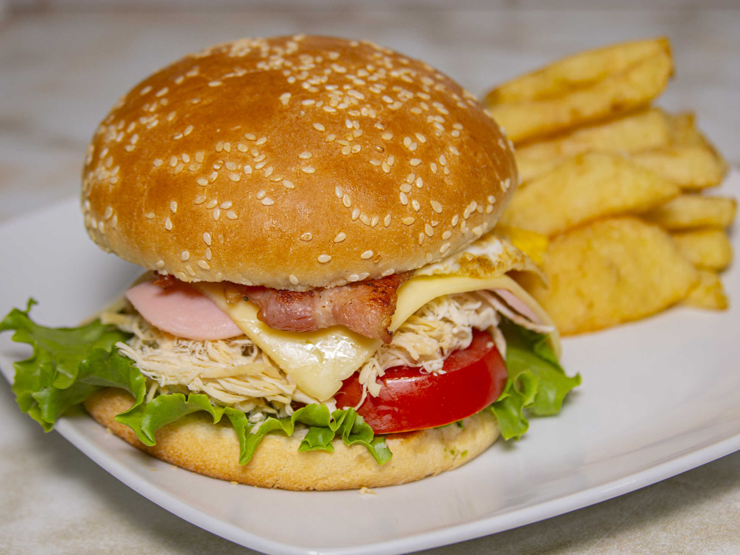 Pollo deshilachado - Jamón inglés - Huevo - Queso - Tomate - Papas Fritas - Mayonesa