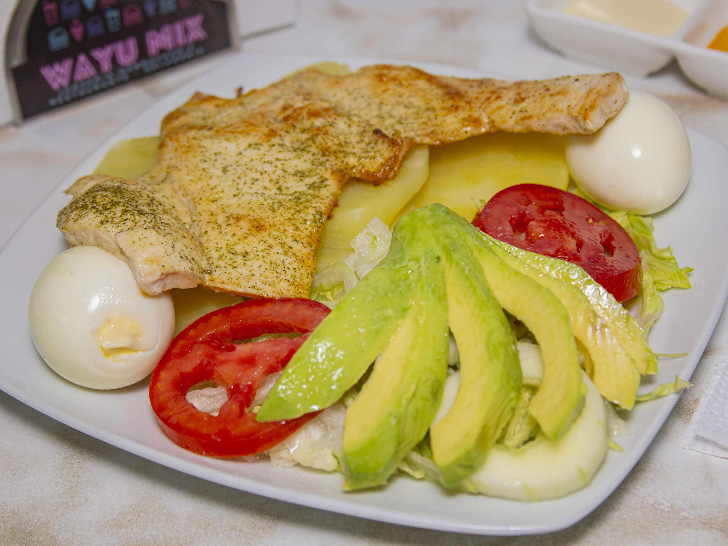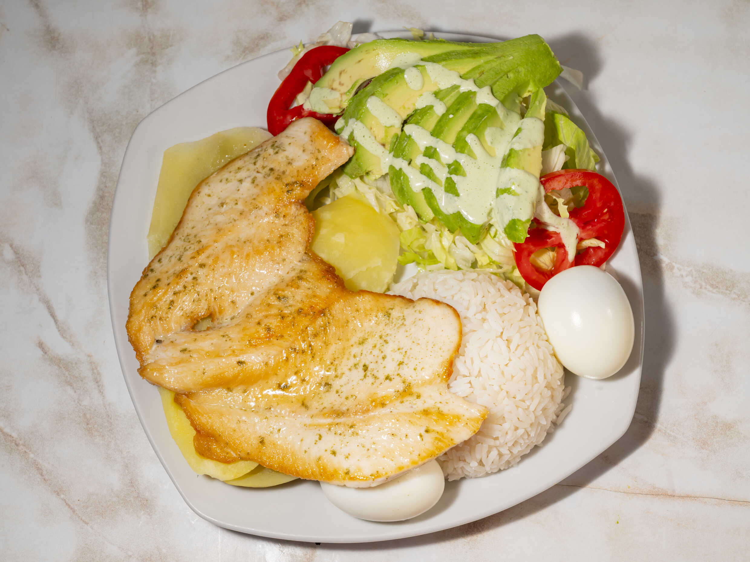 Arroz o Papa Sancochada - Filete de Pollo - 2 Huevos Sancochados - Lechuga - Palta - Tomate