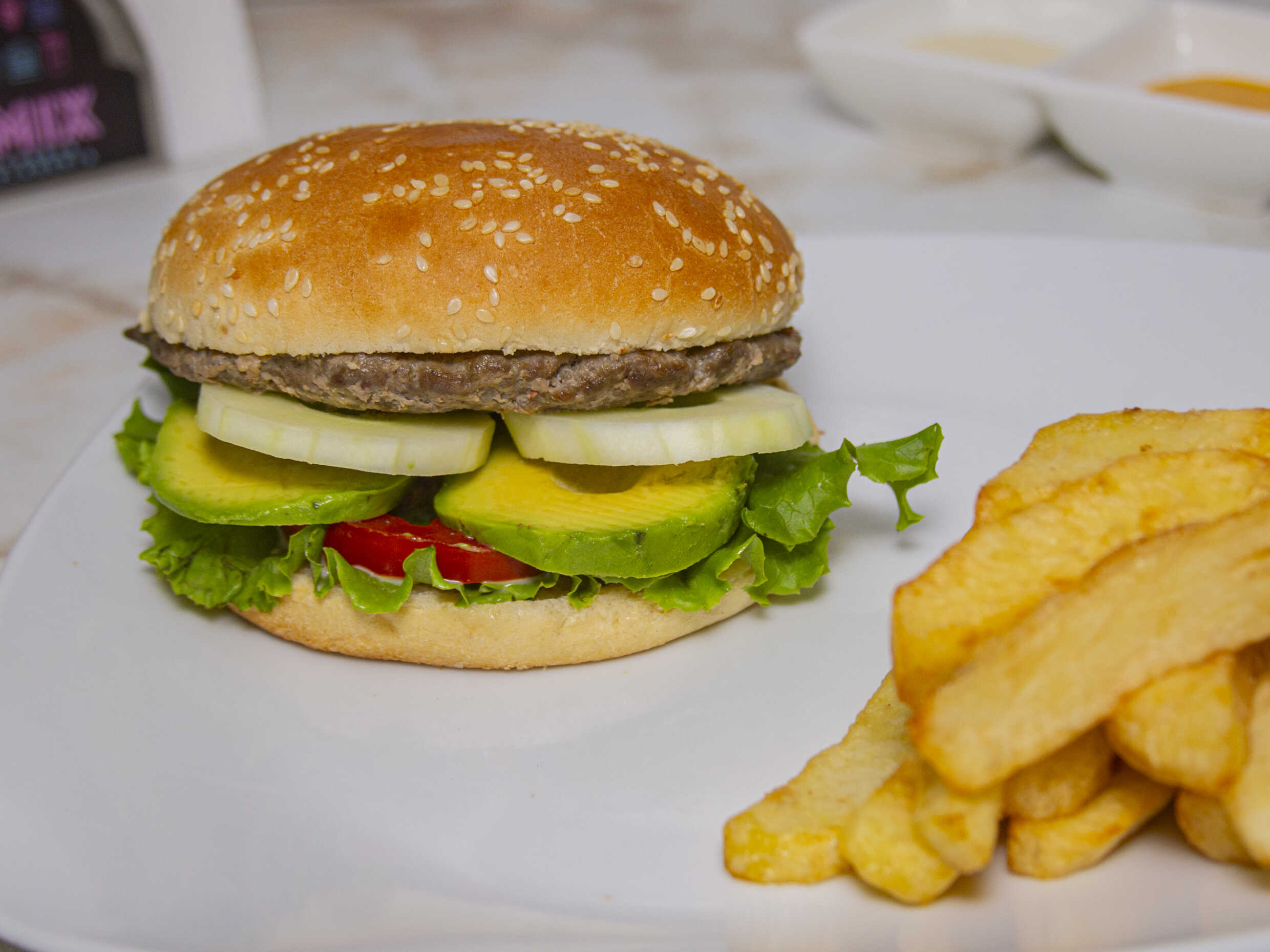 Hamburguesa casera/ Papas / Palta / Pepino / Lechuga / Cremas