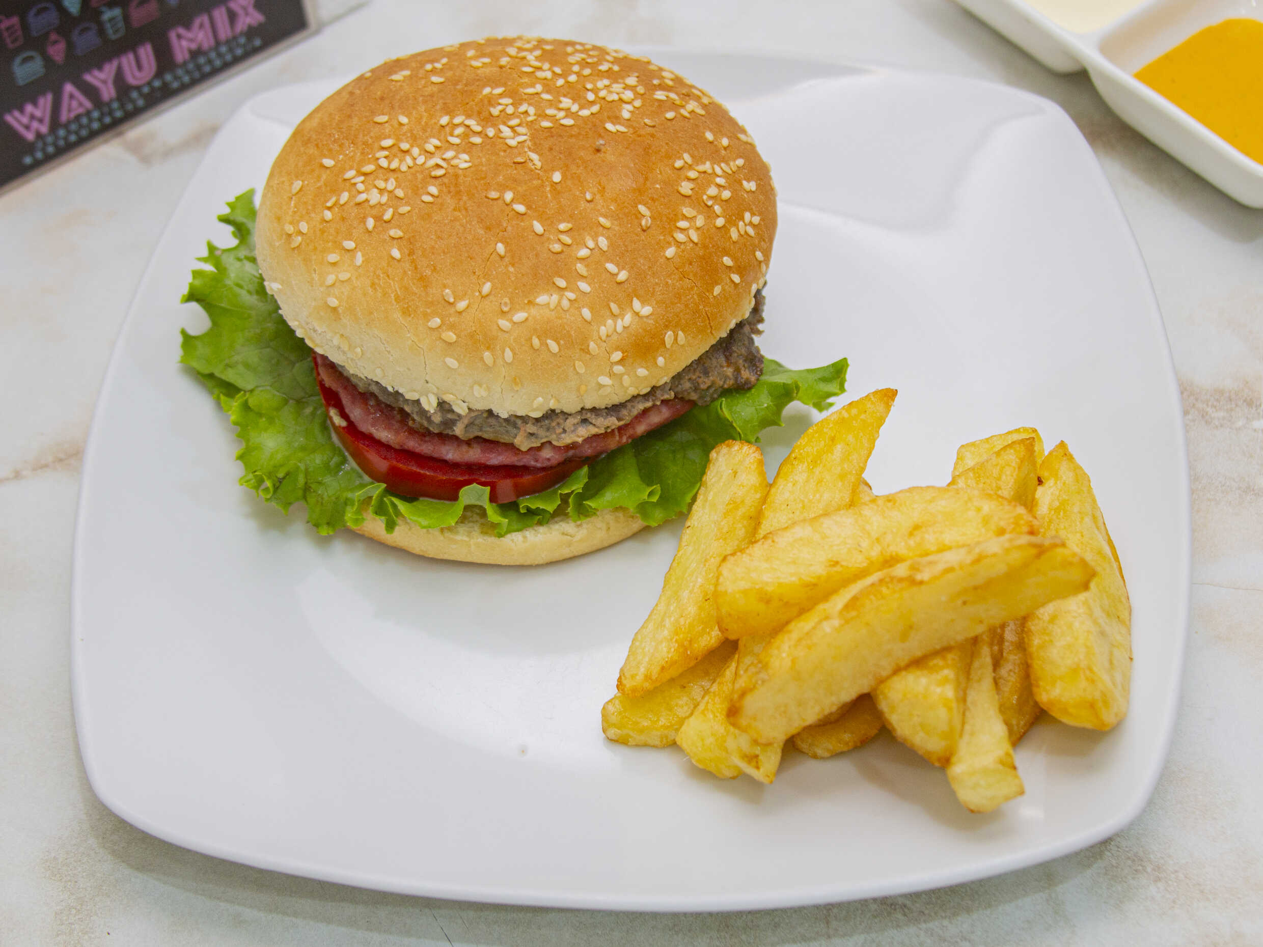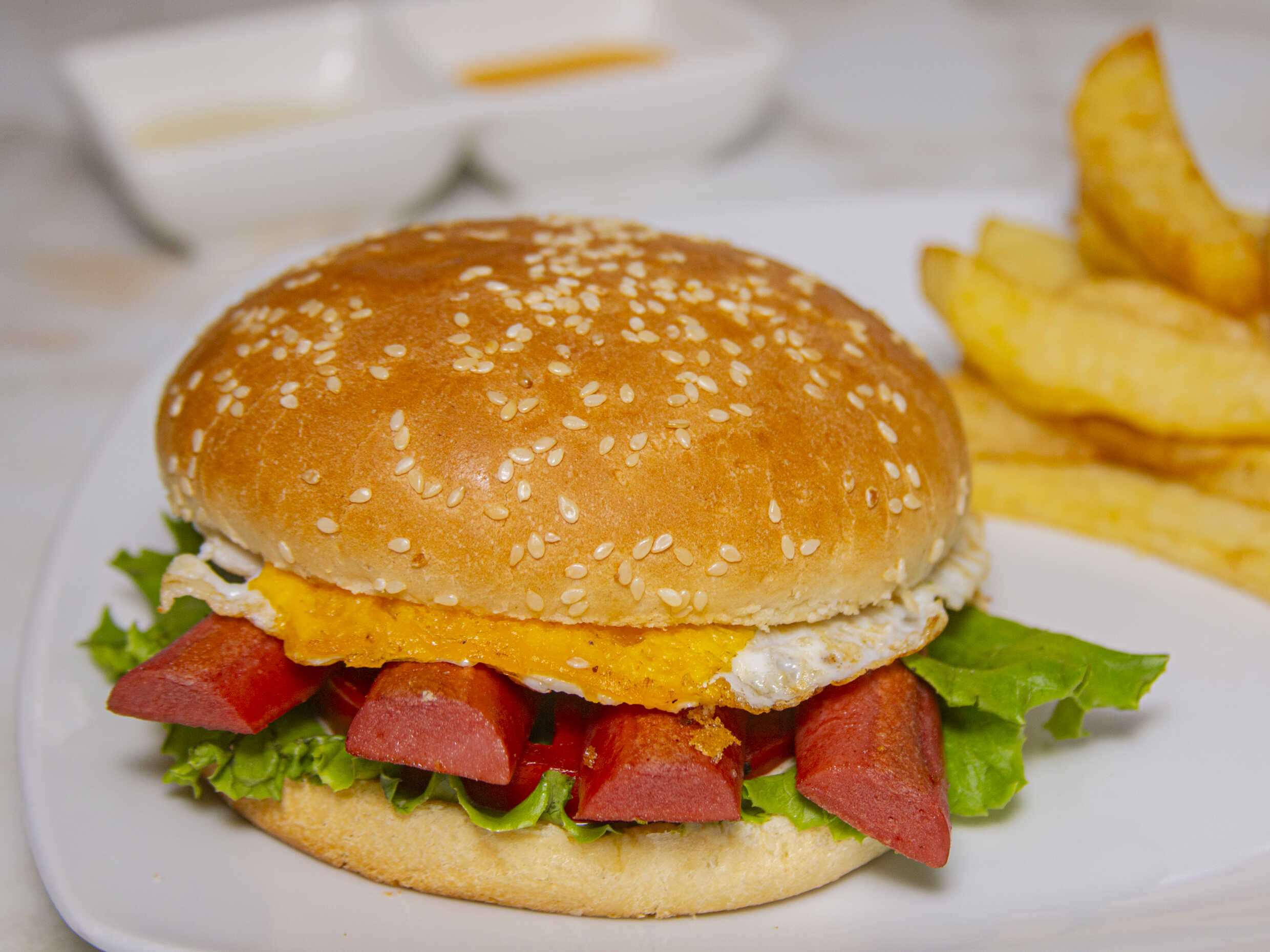 Hamburguesa casera / Jamón inglés / Tocino / Papas / Lechuga / Tomate / Cremas