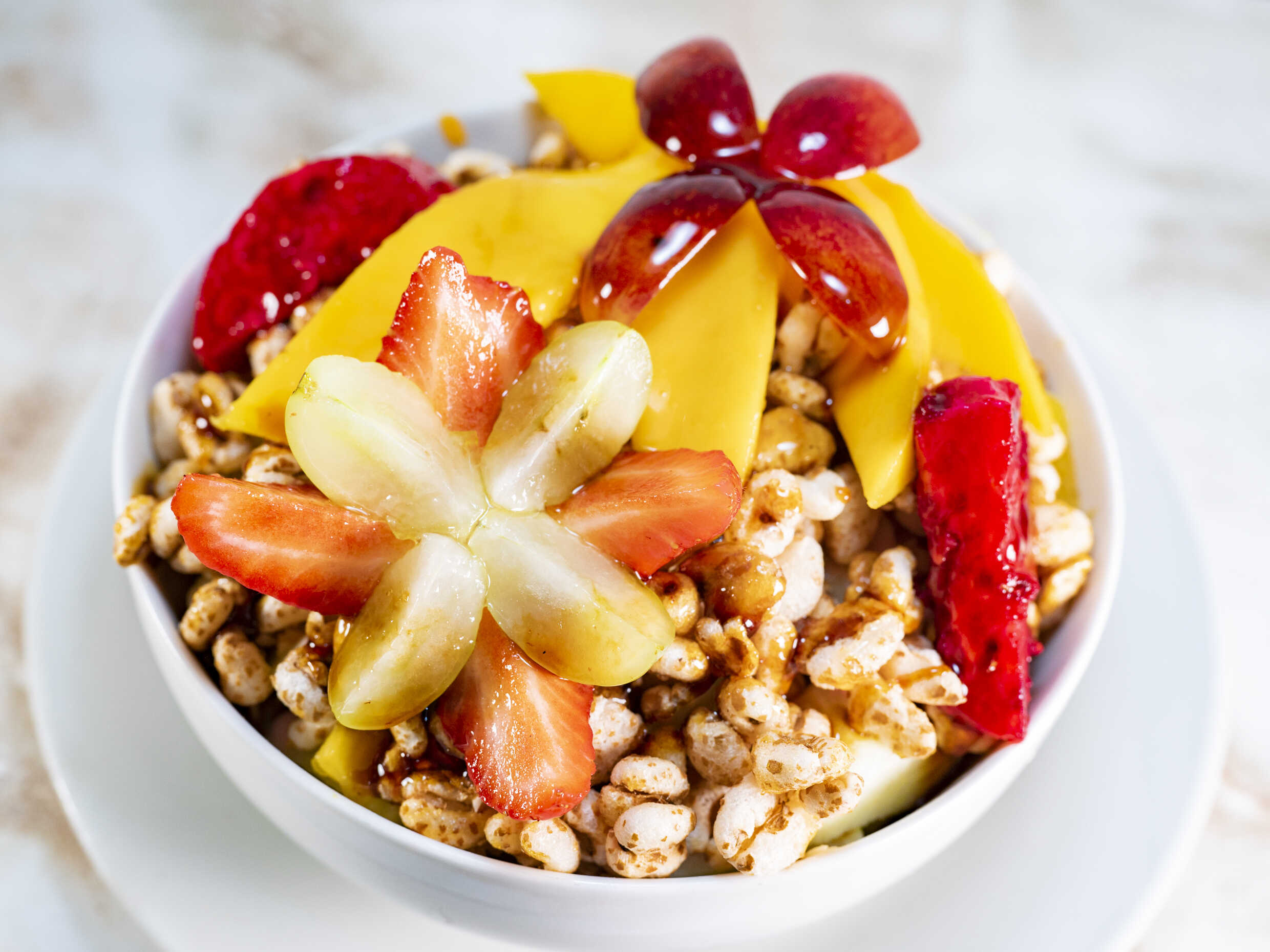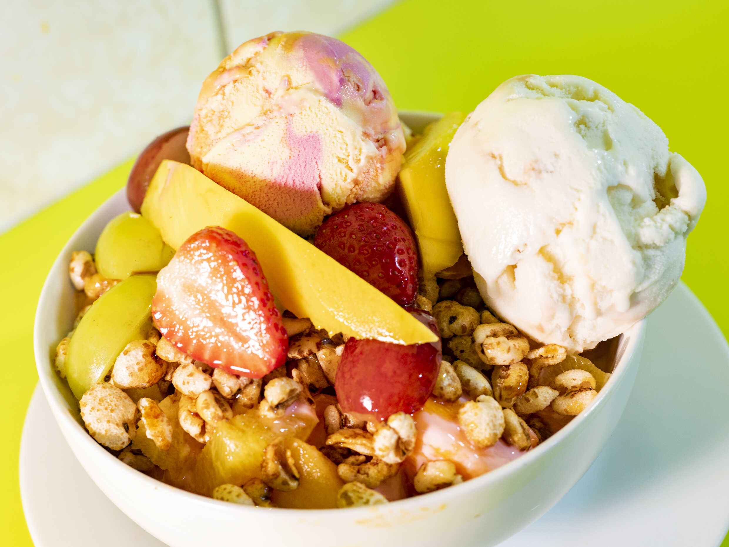 Frutas variadas, trigo, miel, algarrobina, yogurt y 2 bolas de helado.
