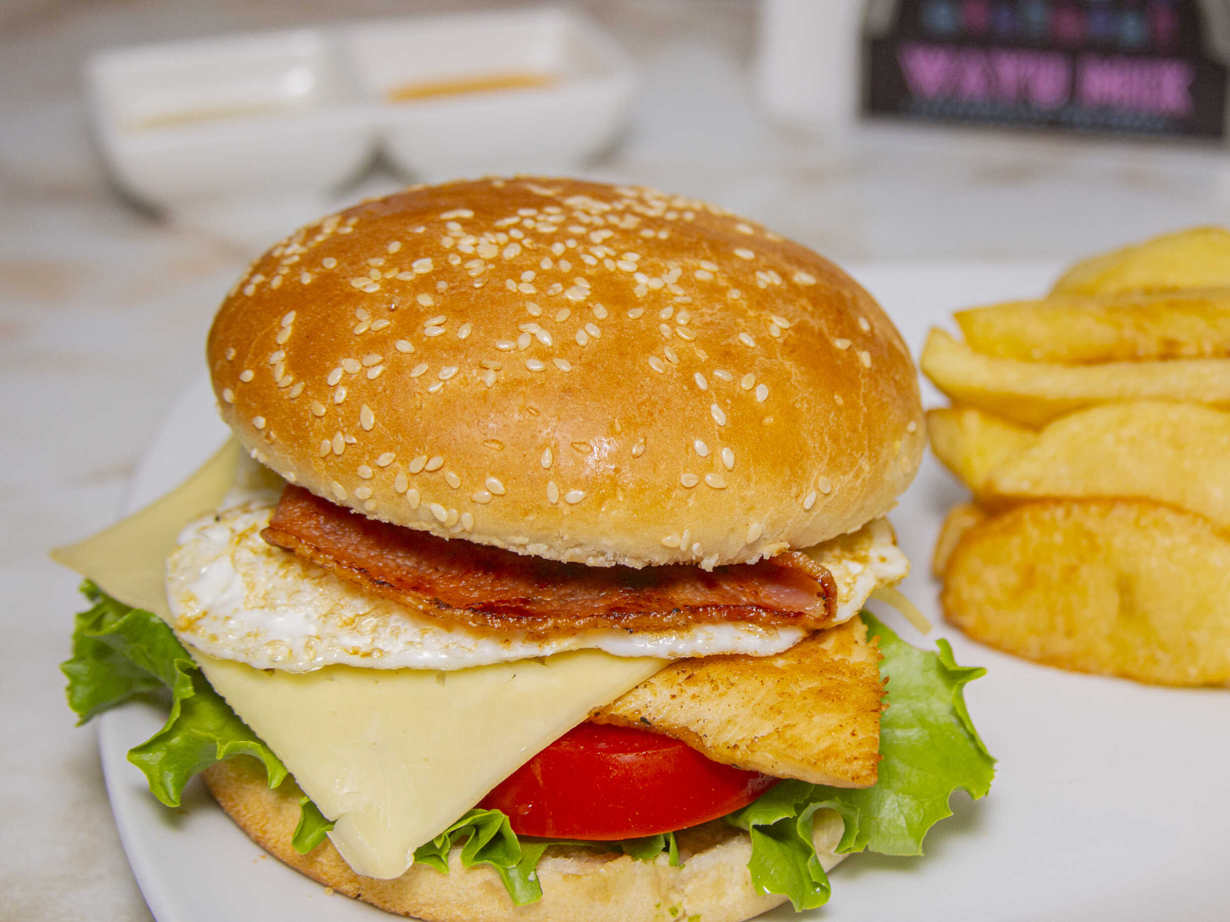 Filete de pollo / Huevo / Tocino / Papas / Lechuga / Tomate / Cremas