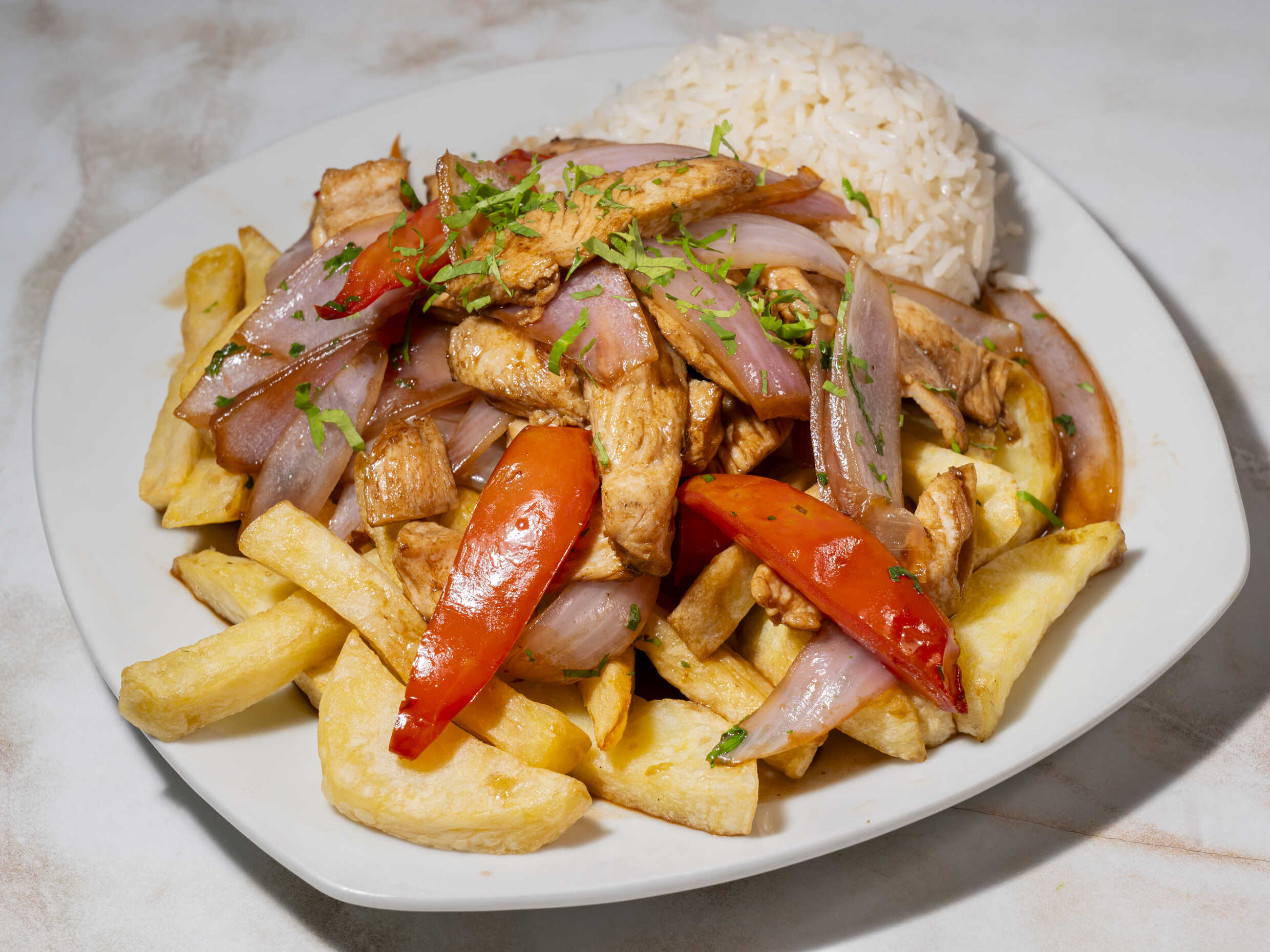 Saltado de pollo - Arroz - Papas Fritas