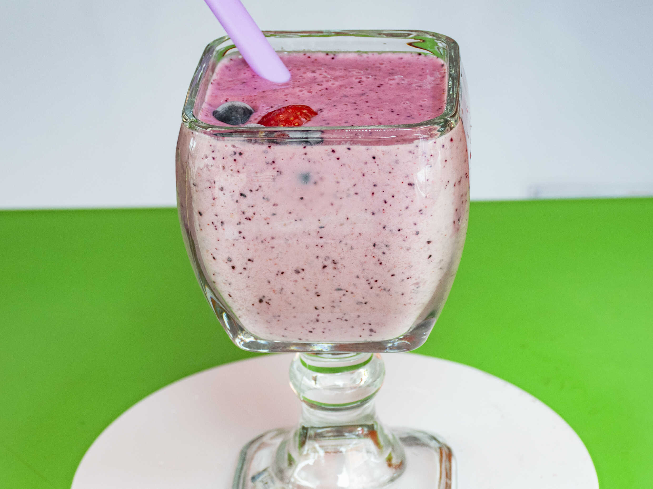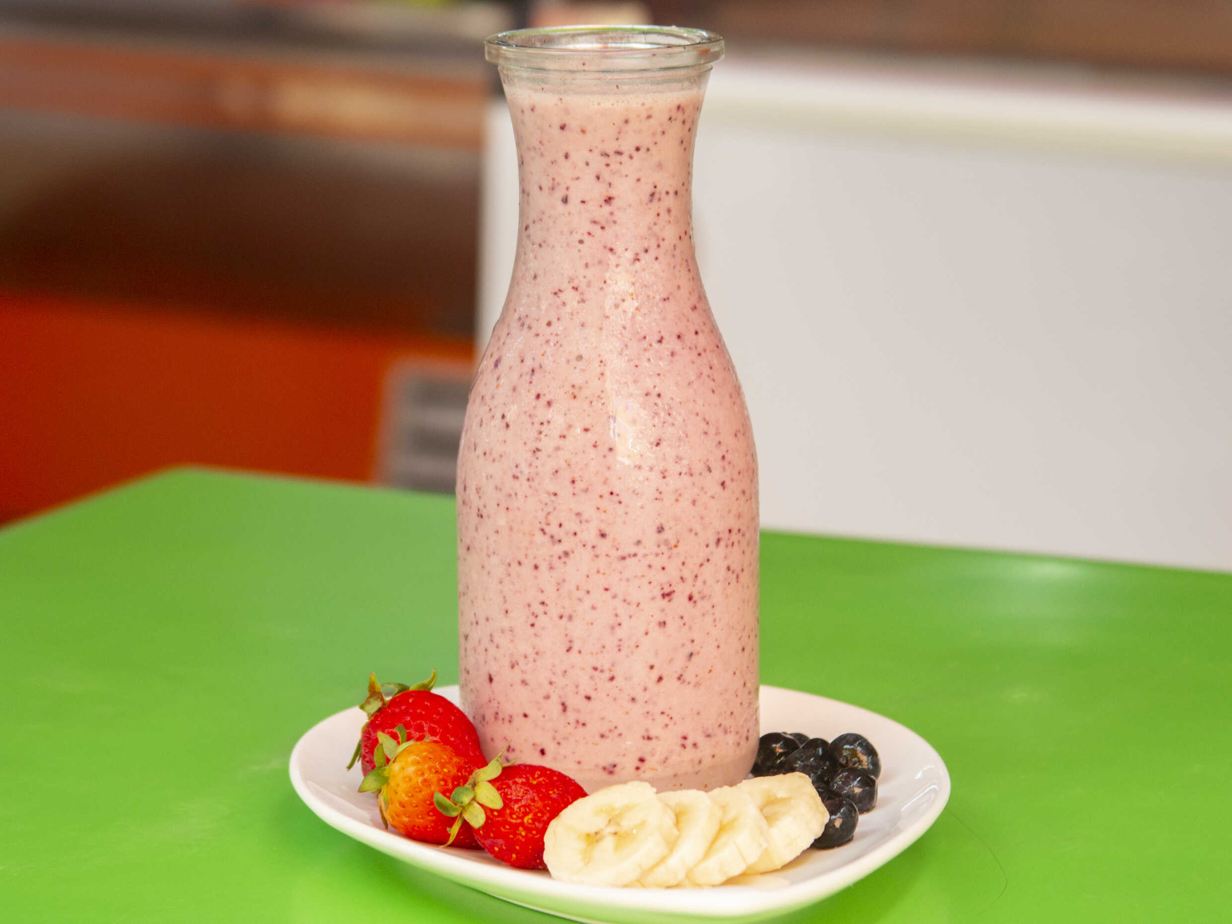 Licuado espeso de fresa, arandano, plátano y leche 12oz.