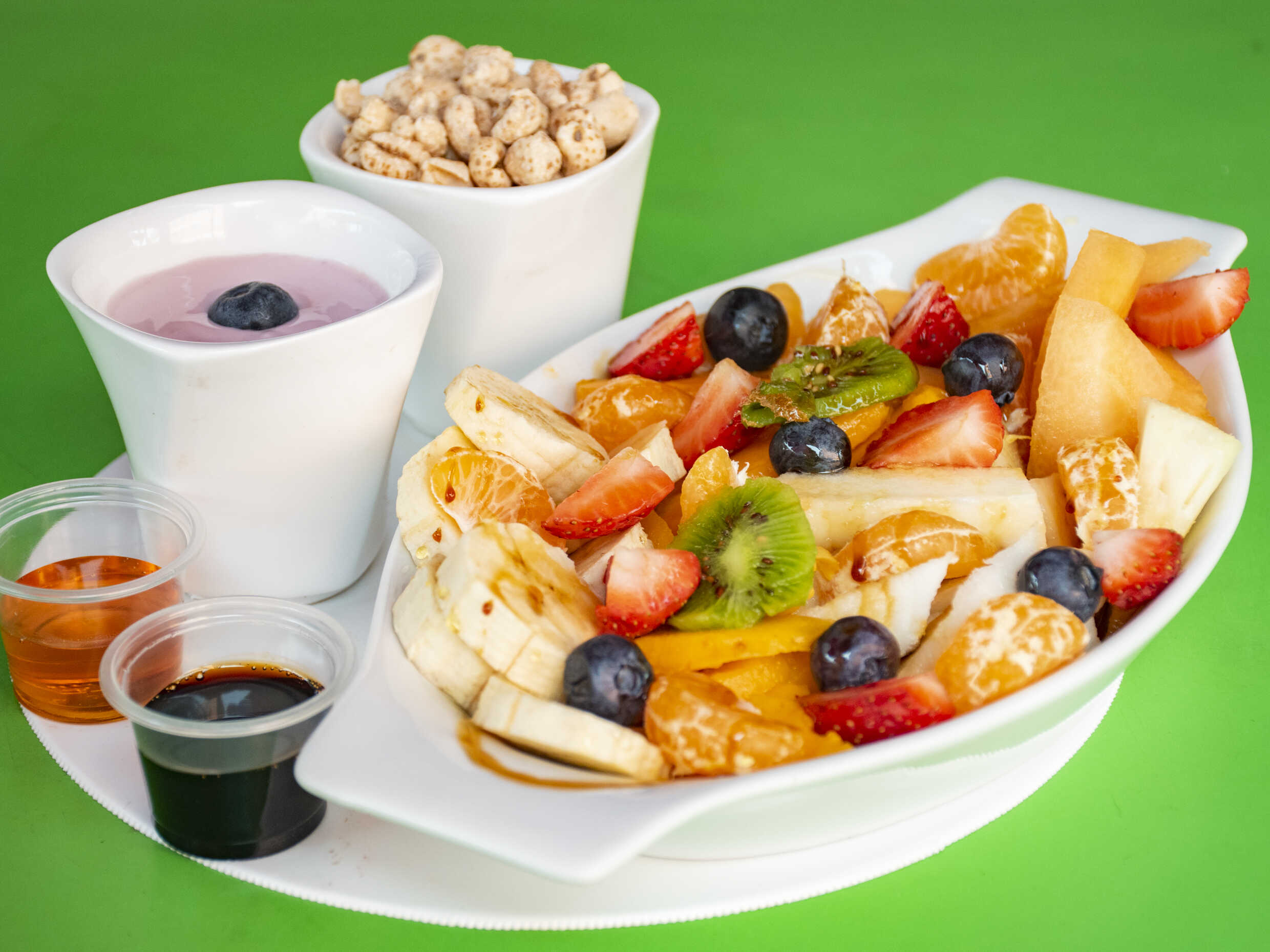 Mix de frutas picadas con yogurt de fresa, miel, algarrobina y cereal en diferentes envases.